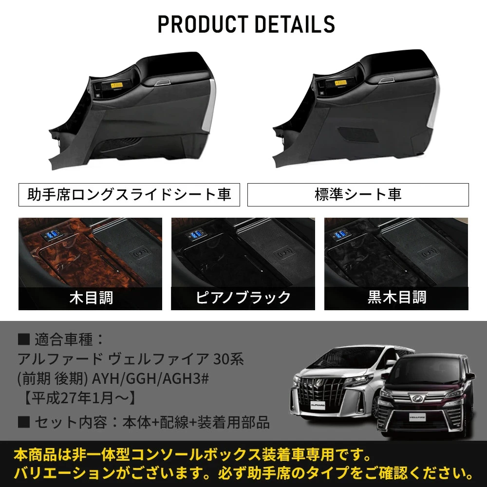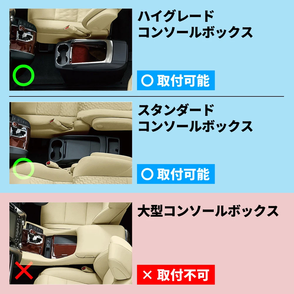| アルファード ヴェルファイア 30系 前期 後期 AYH/GGH/AGH3## 【平成27年1月~】 ※スタンダードコンソールボックス(非一体型コンソールボックス)装着車用 ※一体型コンソールボックス(ハイグレードコンソールボックス等)搭載車適合不可 |