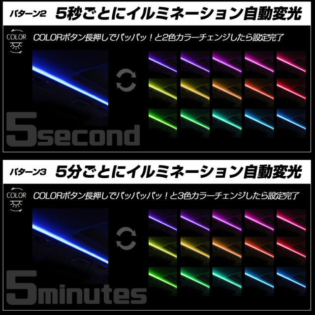 | エンジンを切るたびに消えていたルーフイルミネーションを最大限に活用!エンジン始動後もイルミネーションが点灯し続けます。 | 簡単操作でお好みのイルミネーションパターンが楽しめます。 COLORボタン長押しをするごとに3つのパターンが切り替わります。 常時発光 / 5秒ごとに変光 / 5分ごとに変光 |
