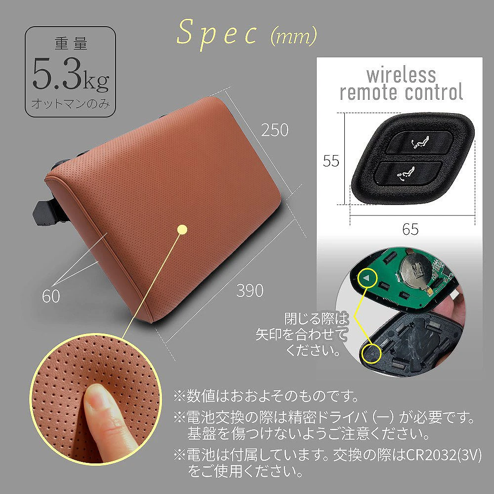 | ※ナットの形状を変更しました。向きはどちらでも取付けできます。 ※極端に厚みのあるフロアマットを装着の場合、オットマンを完全に下げた状態で座席をスライドさせるとオットマンやフロアマットが擦れてしまう恐れがあるのでご注ください。 ※オットマンを上げすぎてしまうと足が挟まってしまう場合がございます。お子様お一人での操作はお控えください。 ※走行中にシートベルトが機能しない状態でのご利用は安全性のため控えてください。 ※電池交換の際は、精密ドライバー(ー)が必要です。基盤を傷つけてしまうとオットマンが動作しなくなる可能性がございます。傷つけないようにご注意ください。 ※電池は付属しています。交換の際はCR2032(3V)をご使用ください。 ※グレード・追加オプション・エアロパーツ・社外品等を装着している車によっては形状が合わない場合があります。お乗りのお車と商品画像を見比べて合うことをご確認の上、ご購入をお願いいたします。 ※車両適合情報は本製品発売時のものになります。その後の車両側の仕様変更や改修によっては正常に動作/適合しない場合がありますのでご注意ください。 ※取り付けの際の工賃等の請求は一切受け付けません。 ※お取り付けは、自己責任にて、作業を行って下さい。お客様責任による破損での対応は受付できません。 ※必ずフィッティング確認を行ってから取り付けてください。 ※社外品につき小傷等がある場合がございますが、使用に支障がない限り交換、返品はいたしません。 ※本製品を使用したことによる直接、間接的に生じた事故、損害、破損についての責任は弊社は一切負いません。 ※モニターの環境により商品の色合いや素材感などが異なる場合がございます。 ※商品は予告なく仕様変更もしくは販売終了している場合がございますのであらかじめご了承ください。 ※国外への配送はEMSでの発送です。ご注文後、弊社よりメールにて別途送料などをお知らせいたします。 ※本商品は2025年8月4日仕様変更しました。 |