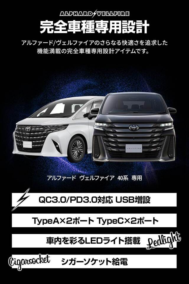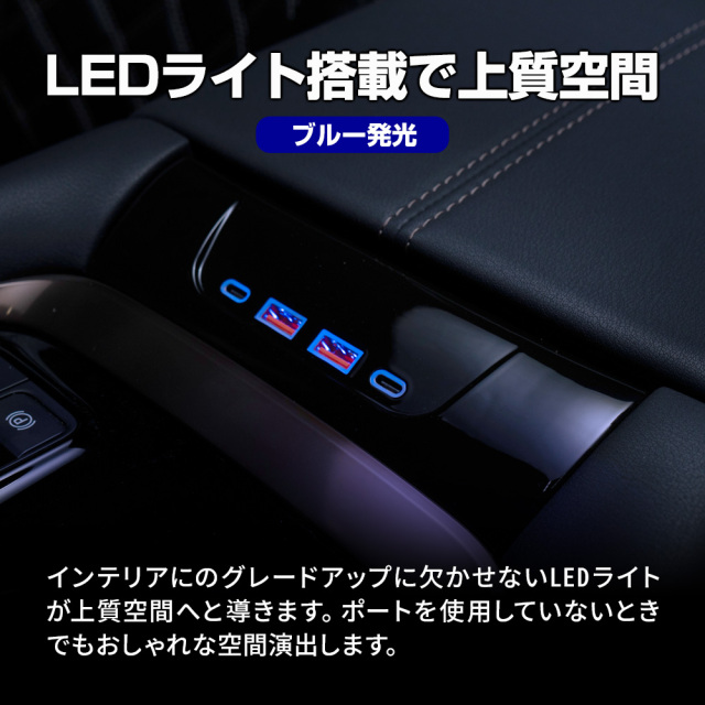 4ポートUSB増設 後部座席でもスマホやiPhoneの充電が可能! アルファード ヴェルファイア 40系 USB 増設ユニット 1Pです。 [ 材質 ] ABS材質 LED [ カラー ] ピアノブラック(LED:ブルー発光) [ セット内容 ] 本体1p+配線1p [ 特徴 ] 4ポート増設(高速充電対応 Type-A:2port Type-C:2port) ■適合車種 アルファード ヴェルファイア 40系 AAHH AGH TAHA 40 R5.6~