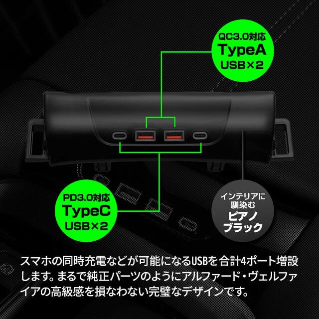 | 製品名: | アルファード ヴェルファイア 40系 USB 増設ユニット 1P TypeA×2 TypeC×2 同時充電 急速充電 スマホ iPhone アンドロイド LED搭載 トヨタ |