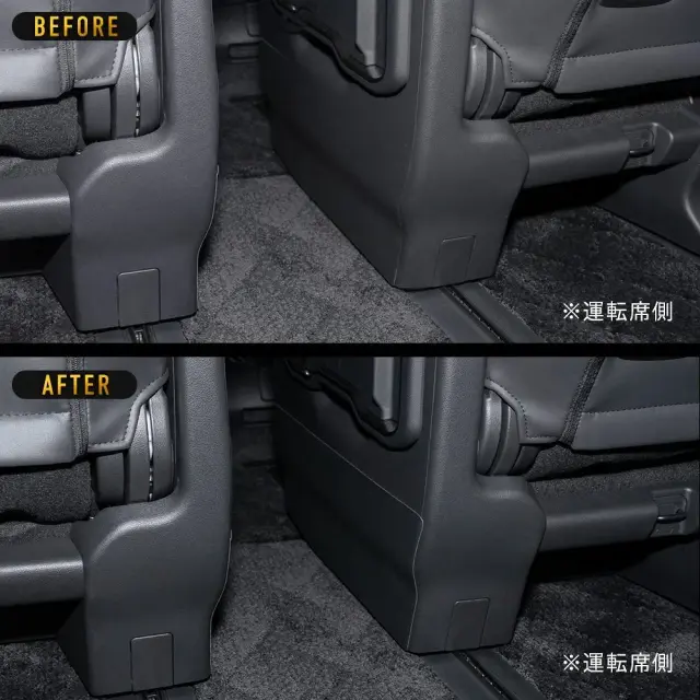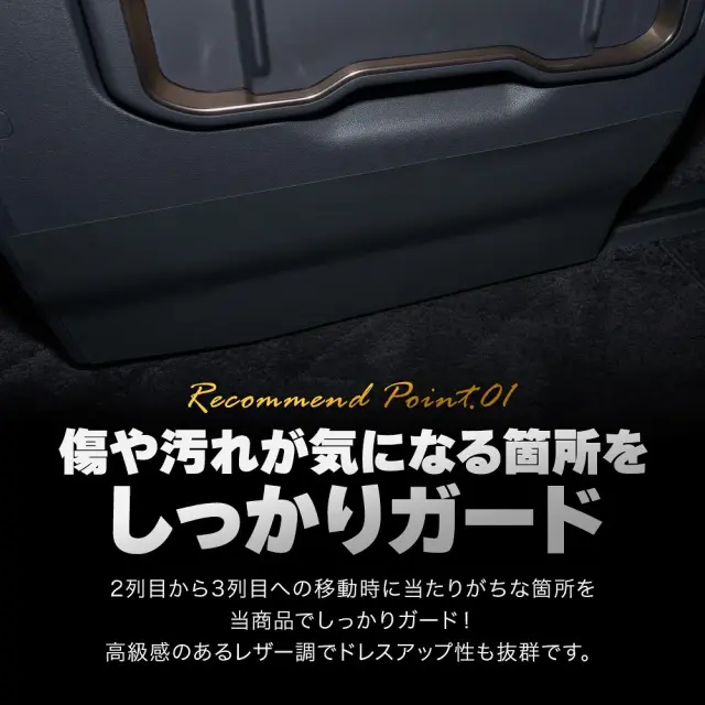 アルファード ヴェルファイア 40系専用の2列目ウォークスルーキックガードです。高品質なPVC素材を使用し、2列目から3列目への車内移動時に、靴が当たることによる傷や汚れをしっかり保護します。専用設計のため、ぴったりとフィットし、取り付けも簡単です。車内のドレスアップにもなり、カスタム初心者の方でも、手軽に愛車をグレードアップできるおすすめのアイテムです。