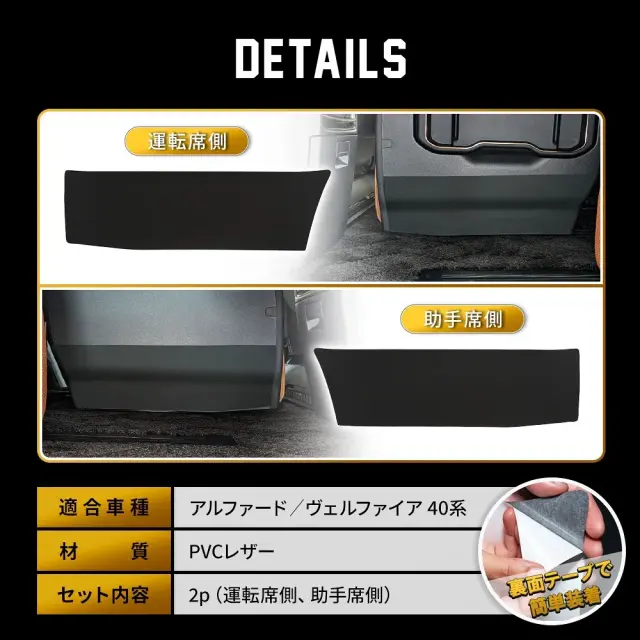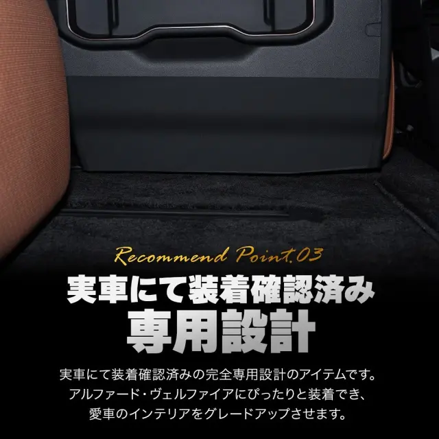 | 製品名: | アルファード ヴェルファイア 40系専用のキックガード。2列目ウォークスルーの傷や汚れを防止する当社オリジナルの内装カスタムパーツです。 |