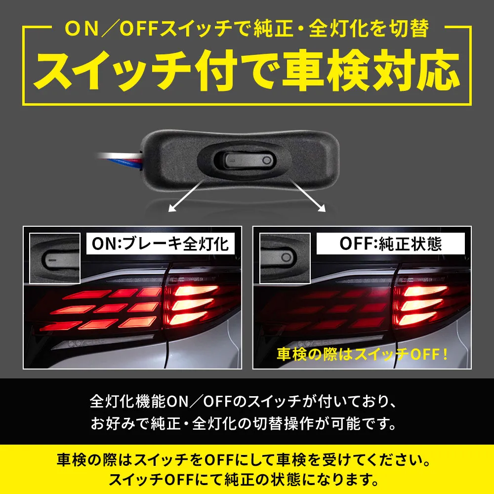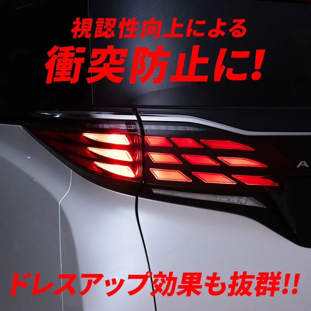 アルファード 40系 Xグレード専用のブレーキ全灯化キットは、通常スモール時にしか点灯しないテールランプ内のLEDを、ブレーキ時にも連動して点灯させる注目のカスタムパーツです。点灯面積が大きく広がることで、リアビューの存在感が劇的にアップ!ドレスアップ効果はもちろん、後続車への視認性も向上します。純正配線を傷つけないカプラーオン設計により、簡単に取り付けが可能です。簡単に機能を停止できるスイッチ付き。車検時や純正状態に戻したい時も、ワンタッチで切り替えが可能です。