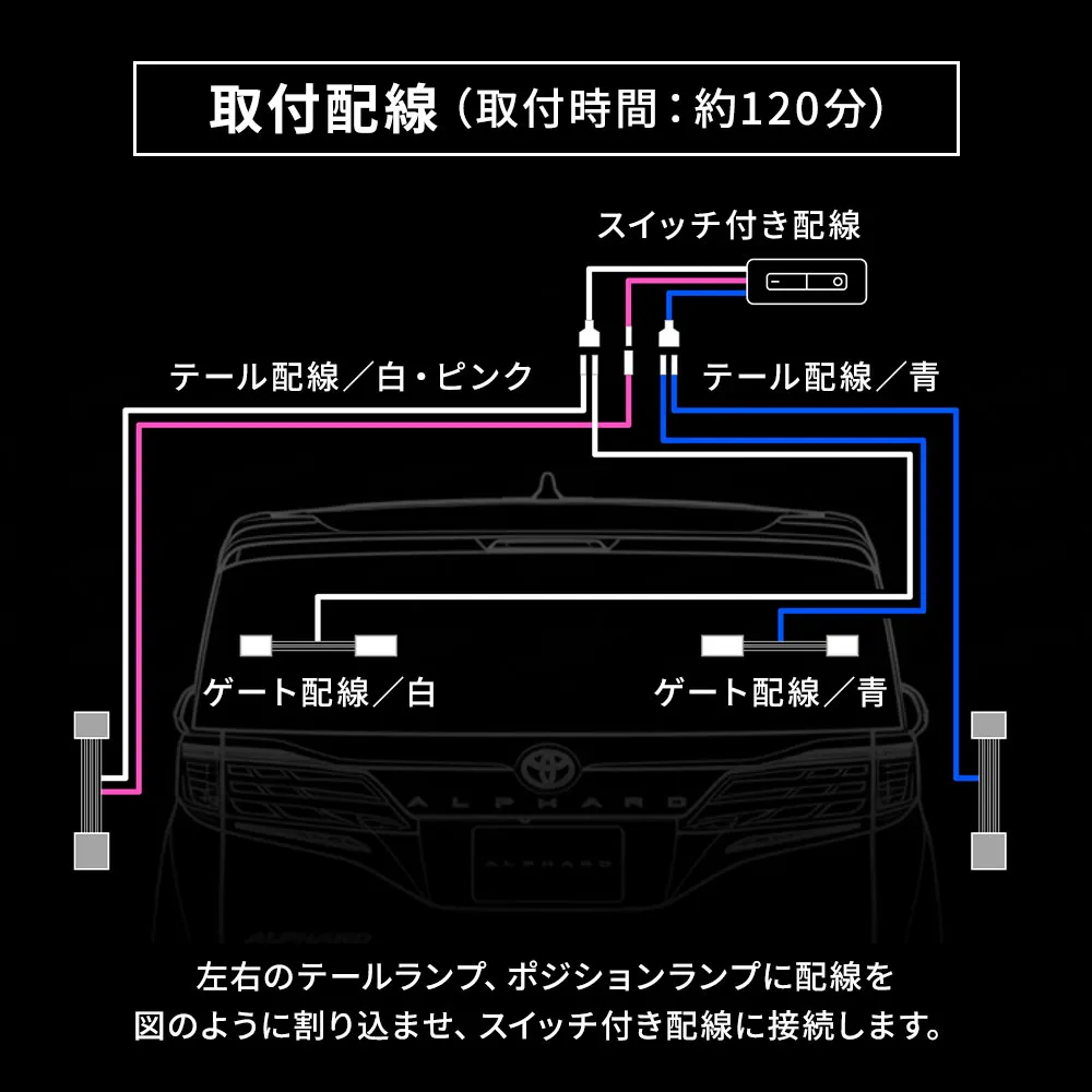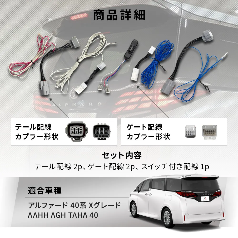 ブレーキ全灯化で後続車の視認性をUP! 追突防止 スイッチ付 アルファード 40系 Xグレード ブレーキ 全灯化 キットです。 [ 材質 ] カプラー配線 [ 特徴 ] 視認性の向上し衝突防止に活躍。ドレスアップ効果 [ セット内容 ] テール配線×2、ゲート配線×2、スイッチ配線×1 [ 装着方法 ] カプラーオンで簡単接続 ■適合車種 アルファード 40系 AAHH AGH TAHA 40 R5.6~ ※Xグレードのみ適合
