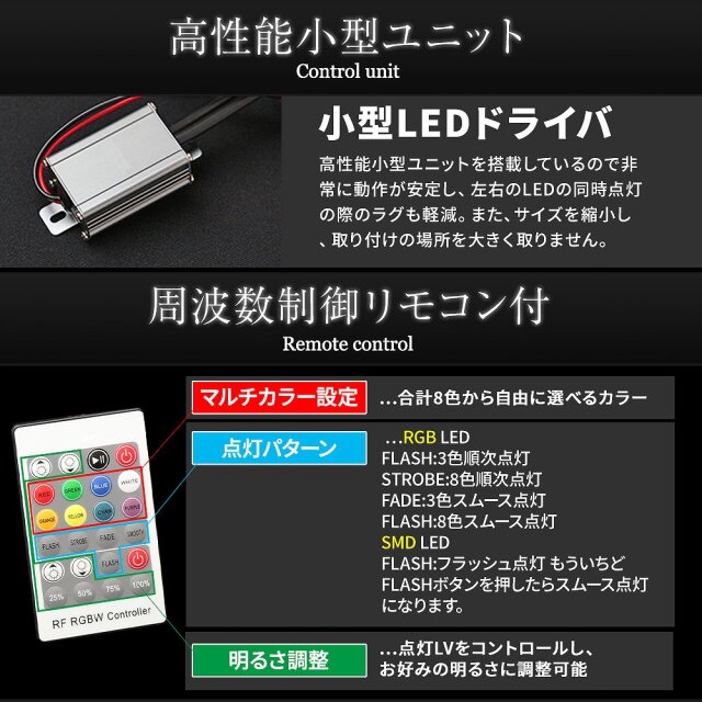 8カラー切替 で足元を明るくライトアップ!新型 アルファード ヴェルファイア 40系 専用RGB フットランプです。 [ 材質 ] LED [ カラー ] RGB8カラー [ セット内容 ] LEDランプ、ドライバ付配線、リモコン、延長分岐配線、取扱説明書 [ 商品特徴 ] 8カラー切替/調光機能搭載 ■適合車種 アルファード ヴェルファイア 40系 AAHH AGH TAHA 40 R5.6~