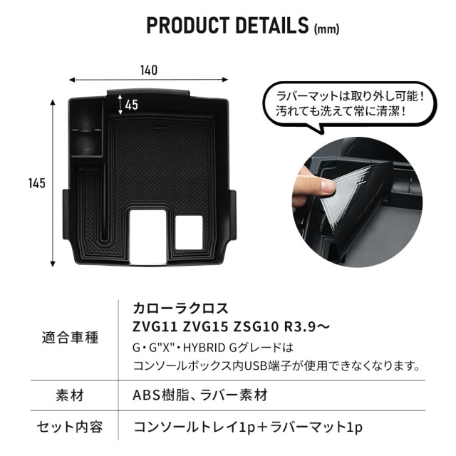 簡単装着でコンソールを二段構造に拡張!収納力・利便性UP!カローラクロス センターコンソールボックス [ 材質 ] ABS樹脂(底面マット:PVC) [ セット内容 ] 本体1p+マット1p [ 装着方法 ] 被せるだけの簡単装着 ■適合車種 カローラクロス ZVG11 ZVG15 ZSG10 R3.9~
