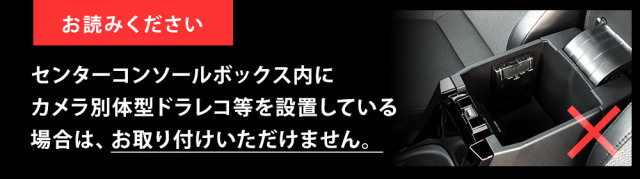 | カローラクロス ZVG11 ZVG15 ZSG10 R3.9~ ※センターコンソールボックス内にカメラ別体型ドラレコ等を設置している場合は、お取り付けいただけません。 |