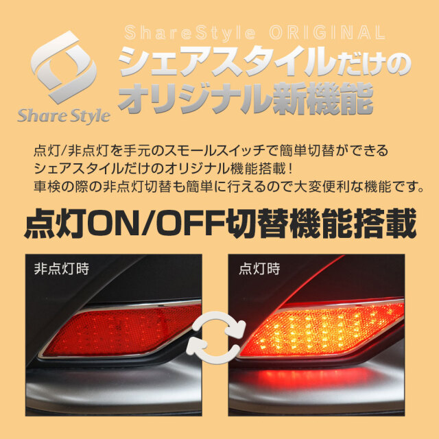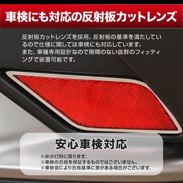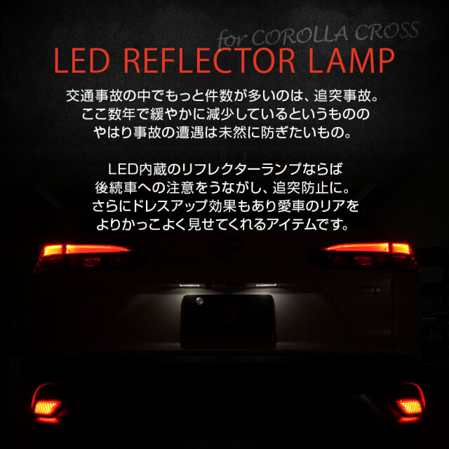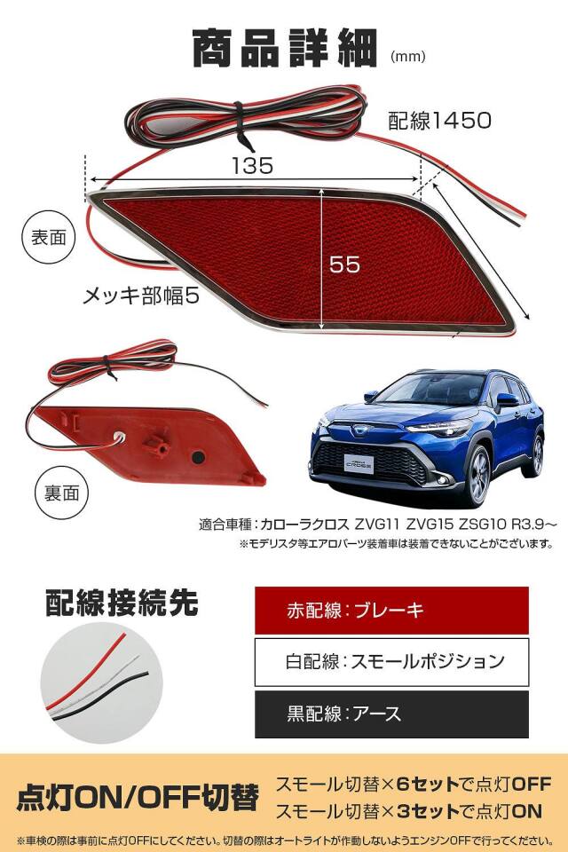 シェアスタイルオリジナル開発!カローラクロス 専用メッキ付き LED リフレクターです。 [ 材質 ] ABS樹脂、LED(メッキつき) [ セット内容 ] 2P+取扱説明書 [ 装着方法 ] 赤配線(ブレーキ) 白配線(スモールポジション) 黒配線(アース) ■適合車種 カローラクロス ZVG11 ZVG15 ZSG10 R3.9~ ※モデリスタ等エアロパーツ装着車は装着できないことがございます。