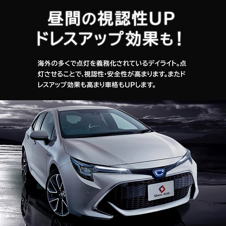 カローラ 210系 ポジションランプデイライト化キットは、カローラスポーツやカローラツーリングのGおよびGXグレードに対応した製品です。このキットはカプラーオン設計により、簡単に取り付けが可能です。エンジン始動と同時にフロントポジションランプが点灯し、車両の外観を一層引き立てます。特に、日中の視認性を向上させることで、安全性の向上にも寄与します。
