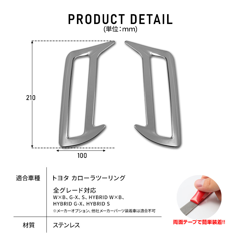 カローラツーリング210系専用のメッキパーツです。 耐久性の高いステンレスを採用しました。 抜群のドレスアップをお楽しみください。