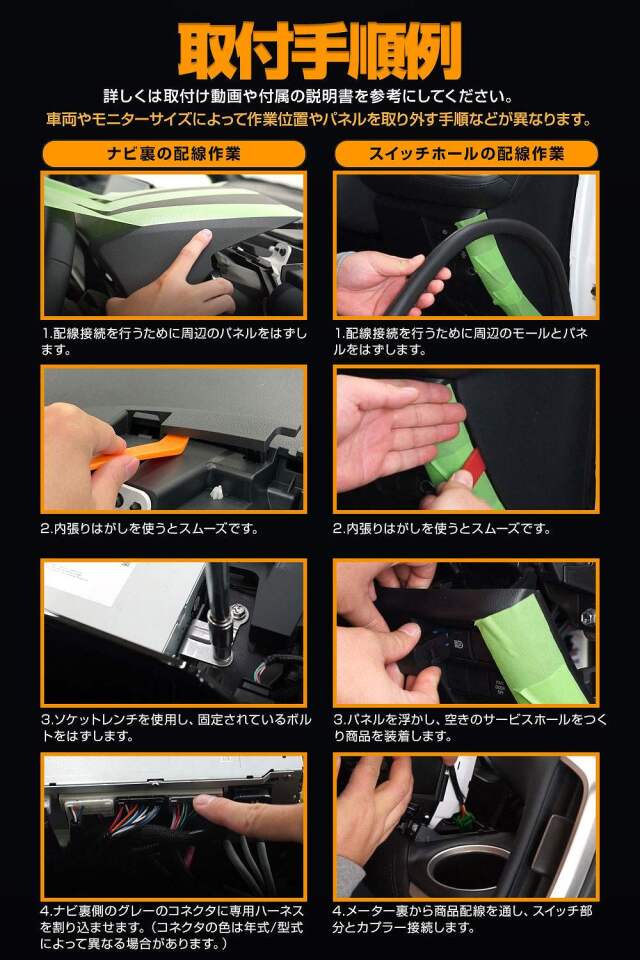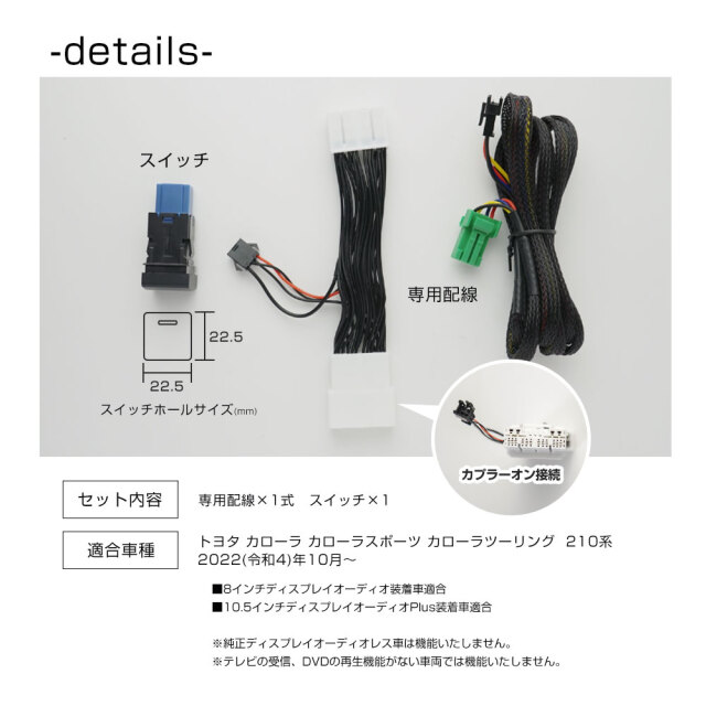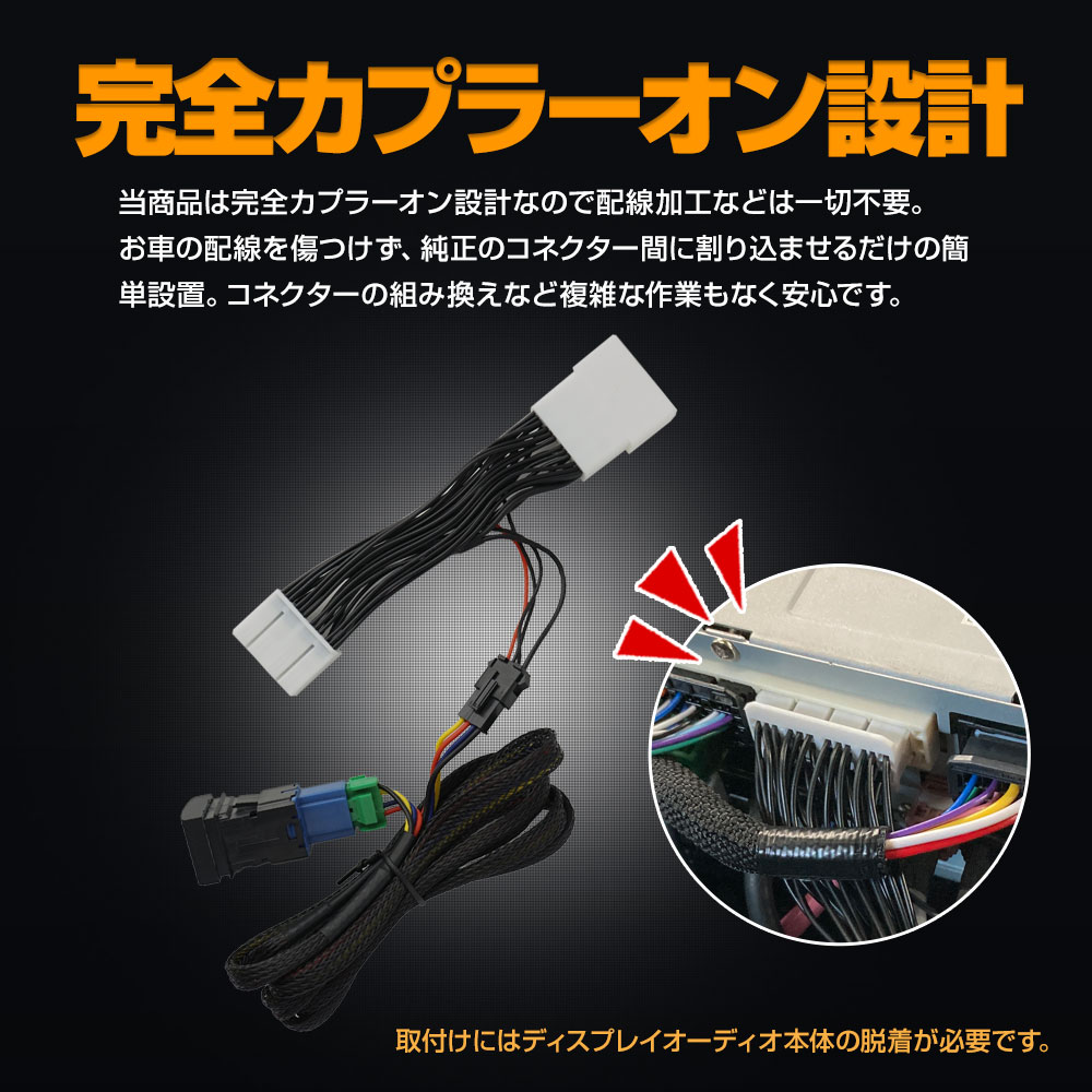 簡単取付で走行中のTV視聴やナビ操作が可能 カローラ カローラスポーツ カローラツーリング 210系 専用ナビキャンセラーです。 [ 材質 ] 配線 [ セット内容 ] 専用配線×1式 スイッチ×1 説明書 [ 装着方法 ] 簡単接続で配線を傷つけないカプラーオン設計 ■適合車種 カローラ MZEA17/ZWE215・219 R4.10~ カローラスポーツ MZEA12H/ZWE219H R4.10~ カローラツーリング MZEA17W/ ZWE215W・219W R4.10~ ・8インチディスプレイオーディオ(コネクティッドナビ対応)搭載車 ・10.5インチディスプレイオーディオ Plus(コネクティッドナビ対応)搭載車