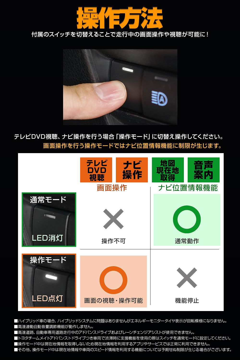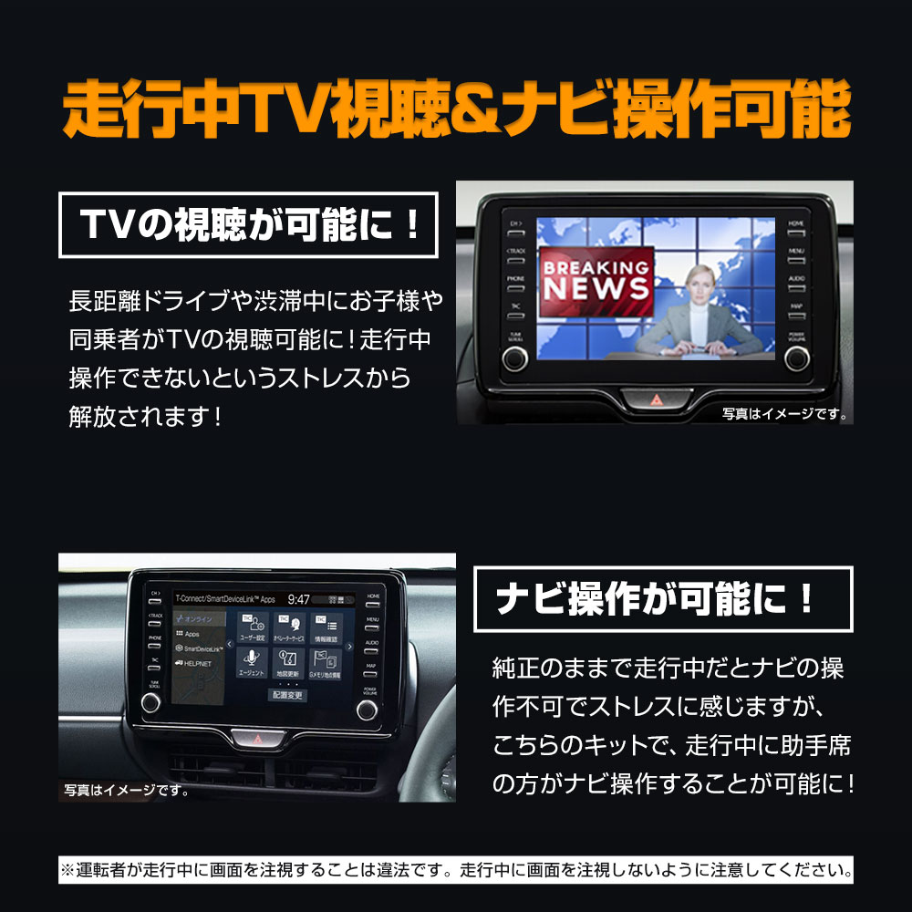 | ※純正ディスプレイオーディオレス車は機能いたしません。年式と適合をご確認ください。 ※テレビの受信、DVDの再生機能がない車両では機能いたしません。 ※テレビDVD視聴、ナビ操作が可能な操作モードでは位置情報機能が停止するため地図現在地取得や音声案内機能、その他位置情報や車速を利用する機能が停止します。通常モードに戻すと通常動作に戻りますが若干タイムラグやエンジンの再始動が必要となる場合がございます。 ※操作モード中のその他の制限事項をご確認ください。 ■ハイブリッド車の場合、ハイブリッドシステムに問題はありませんがエネルギーモニタータイヤ表示が回転模様になりません。 ■高速連動自動音量調節機能が動作しません。 ■高速道路、自動車専用道路走行中のアドバンスドライブおよびレーンチェンジアシストが使用できません。 ■トヨタチームメイトアドバンストドライブつき車両で渋滞時に支援機能を使用の際はスイッチを通常モードに設定してください。 ■操作モード中は現在地情報を取得しないため現在地情報を利用するアプリやサービスでは正常に利用できません。 ■その他、操作モード中は現在地情報や車両のスピード情報を利用する機能については予期せぬ制限が生じる場合がございます。 ※グレード・追加オプション・エアロパーツ・社外品等を装着している車によっては形状が合わない場合があります。お乗りのお車と商品画像を見比べて合うことをご確認の上、ご購入をお願いいたします。 ※車両適合情報は本製品発売時のものになります。その後の車両側の仕様変更や改修によっては正常に動作/適合しない場合がありますのでご注意ください。 ※取り付けの際の工賃等の請求は一切受け付けません。 ※お取り付けは、自己責任にて、作業を行って下さい。お客様責任による破損での対応は受付できません。 ※必ずフィッティング確認を行ってから取り付けてください。 ※社外品につき小傷等がある場合がございますが、使用に支障がない限り交換、返品はいたしません。 ※本製品を使用したことによる直接、間接的に生じた事故、損害、破損についての責任は弊社は一切負いません。 ※モニターの環境により商品の色合いや素材感などが異なる場合がございます。 ※商品は予告なく仕様変更もしくは販売終了している場合がございますのであらかじめご了承ください。 ※国外への配送はEMSでの発送です。ご注文後、弊社よりメールにて別途送料などをお知らせいたします。 |