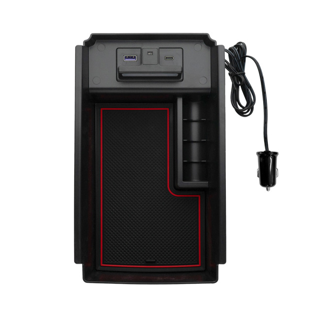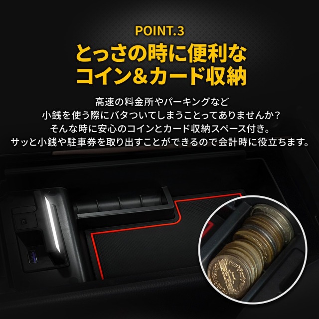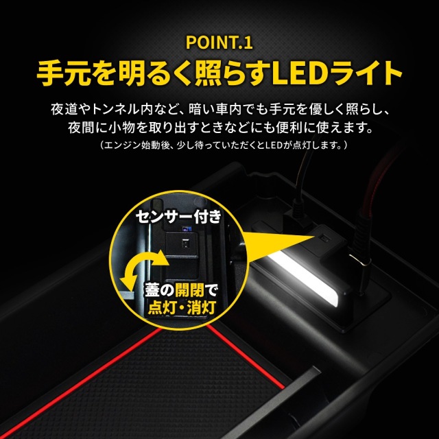 クラウンスポーツ、クラウンクロスオーバー、クラウンエステート専用に設計されたコンソールボックストレイは、車内の収納スペースを効率よく活用できる便利なアイテムです。LEDライトを搭載しているため、夜間でも中身が見やすく、操作性が向上。さらに、2つのUSBポートを備えており、スマートフォンやその他のデバイスをスピーディーに充電できます。機能性とスタイリッシュなデザインを両立し、より快適なカーライフを提供します。