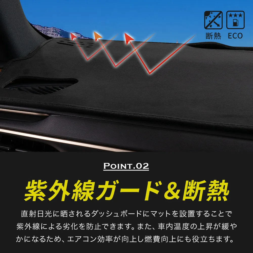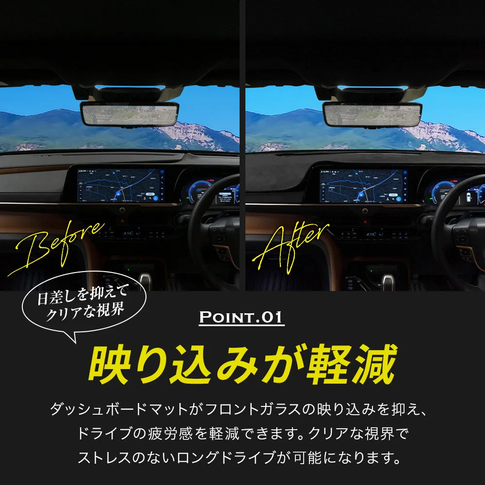 クラウンエステート専用のダッシュボードマットは、快適なドライブをサポートします。スエード調生地を使用し、UVカット機能で日差しを抑え、フロントガラスへの映り込みを防ぎます。防水・防塵設計により、キズや汚れから内装を守り、長期間美しさを保ちます。さらに、専用設計でフィット感が抜群です。車内のドレスアップにも最適なアクセサリーです。