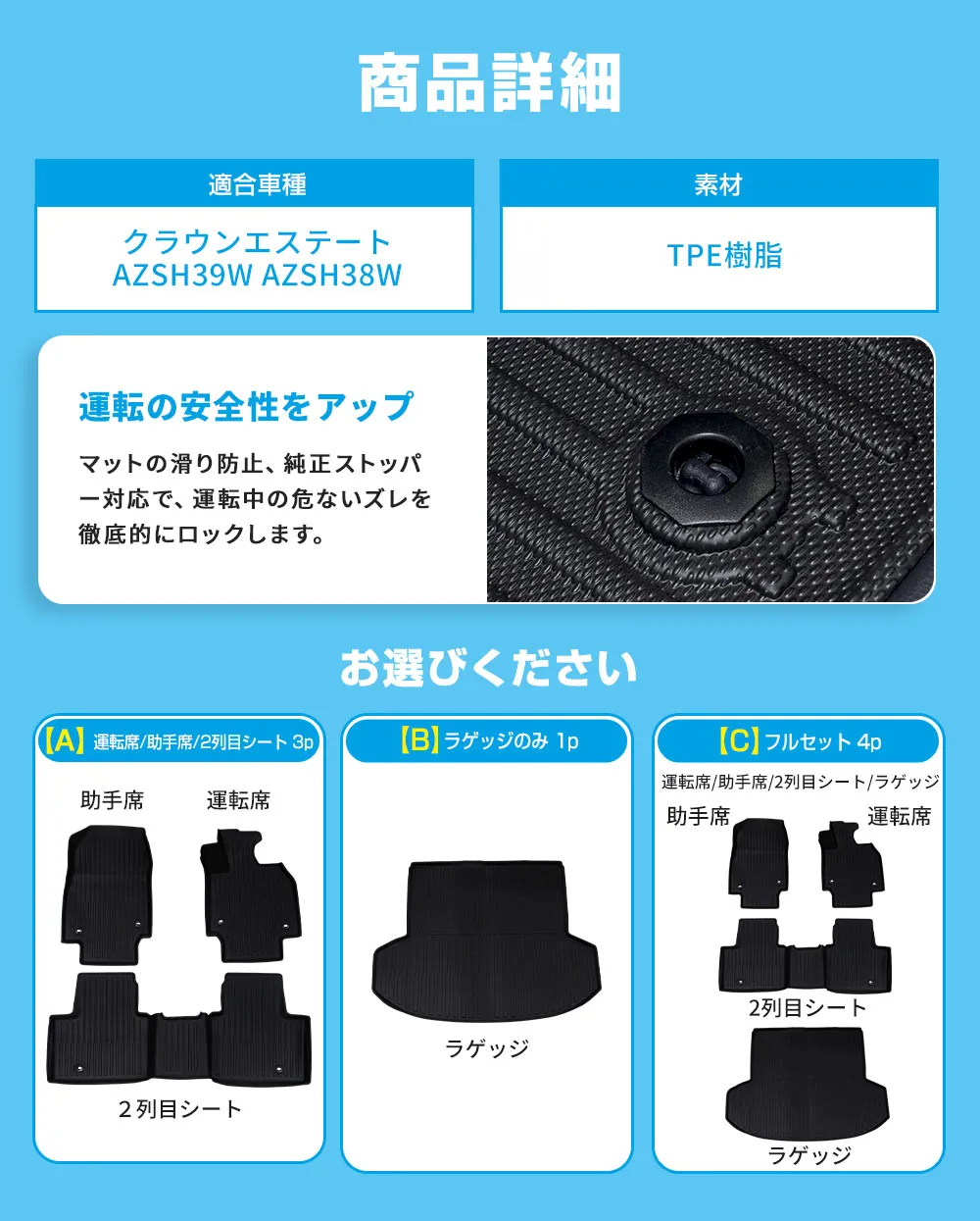 簡単設置で汚れや傷から守る クラウンエステート AZSH39W AZSH38W 3Dフロアマットです。 [ 材質 ] TPE樹脂 [ カラー ] ブラック [ セット内容 ] 【A】運転席 助手席 2列目シート 3p 【B】ラゲッジのみ 1p 【C】フルセット 4p [ 装着方法 ] 置くだけ簡単装着 ■適合車種 クラウンエステート AZSH39W AZSH38W R7.3~