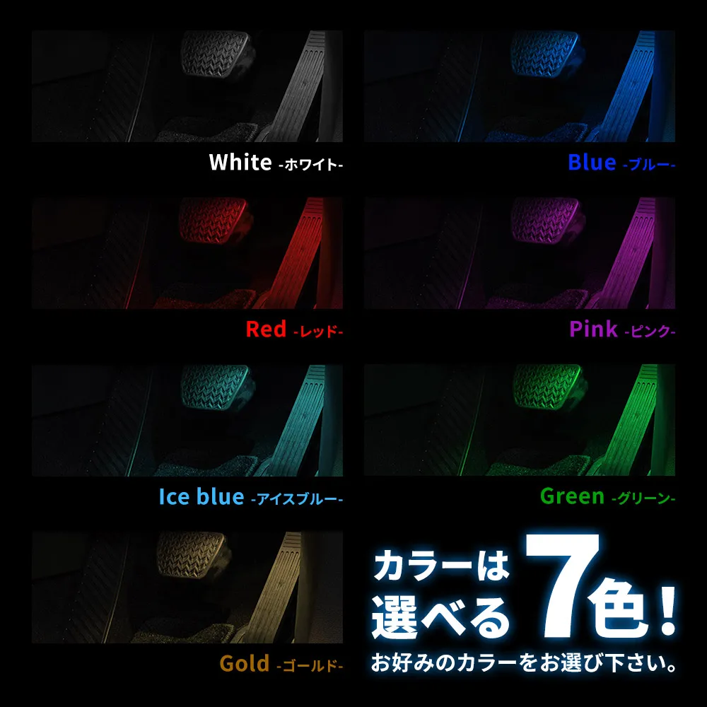 クラウン エステート AZSH39W 38W 専用 LED フットランプは、運転席と助手席の足元をスタイリッシュに照らします。ホワイト、ブルー、ピンク、レッド、アイスブルー、グリーン、ゴールドの多彩なカラーで、車内の雰囲気を自由に演出可能です。明るい光が足元を照らし、乗降を快適にサポートします。インテリアのドレスアップに最適なこの製品は、車内をより魅力的に変えるアイテムです。
