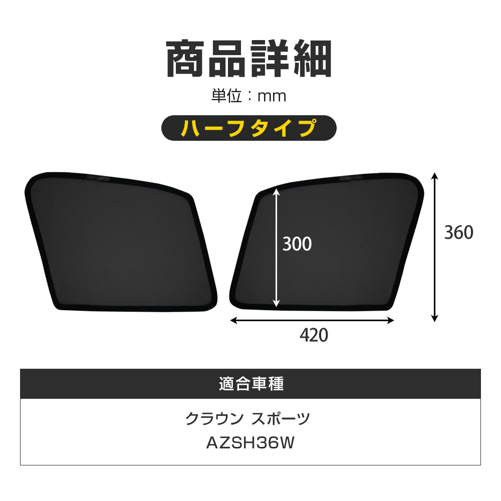 気軽に使えるハーフタイプ日よけ クラウン スポーツ 専用 メッシュシェード 運転席 助手席 ハーフタイプ 2pです。 [ 材質 ] ポリエステル メッシュ素材 [ カラー ] ブラック [ セット内容 ] 本体2P(運転席/助手席)+説明書 [ 装着方法 ] マグネット内蔵フレームで簡単装着 ■適合車種 クラウン スポーツ AZSH36W R5.10~
