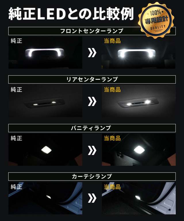 | (フロントのみ) フロントセンターランプ 1p+取扱説明書 (リアのみ) リアセンターランプ 1p+取扱説明書 (バニティカーテシのみ) バニティランプ 2p+カーテシランプ 4p+取扱説明書 (フルセット) フロントセンターランプ 1p+リアセンターランプ 1p+バニティランプ 2p+カーテシランプ 4p+内張りはがし+パッケージ+取扱説明書 |