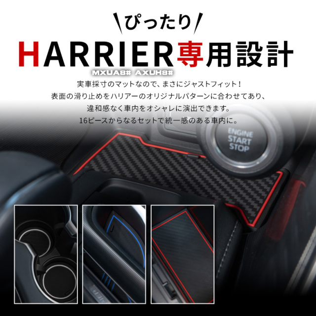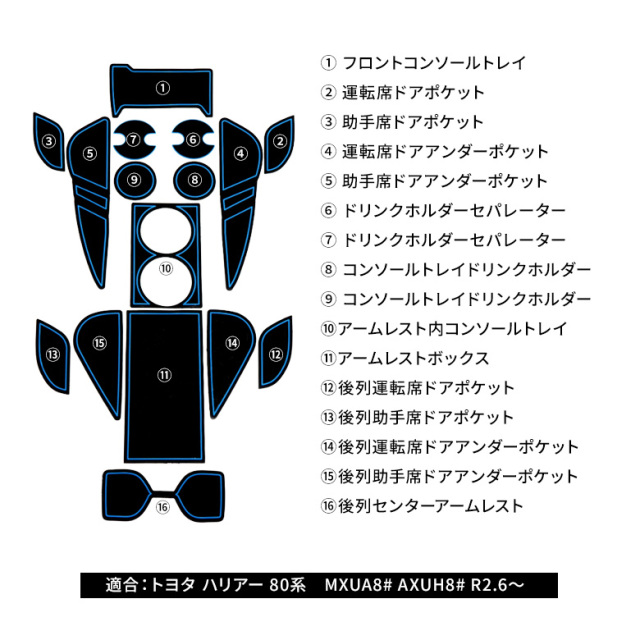 トヨタ ハリアー ラバーマット 16P [ 商品説明 ] ・滑り止めつき・ポケットなどの傷つき防止に・水洗いOKいつでも清潔 [ 材質 ] ラバー [ セット内容 ] 16P+取扱説明書 [ 専用設計 ] トヨタハリアー専用設計 ■適合車種 80系 MXUA8# AXUH8# R2.6~