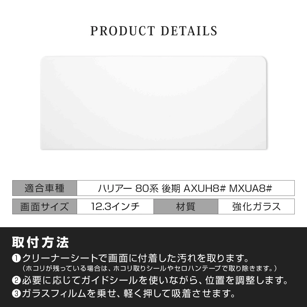 愛車のモニターをしっかり保護 ナビ保護フィルム 12.3インチ ハリアー 80系 後期 ナビ保護フィルム 12.3インチです。 [ 材質 ] 強化ガラス [ 硬度 ] 9H [ セット内容 ] 本体1p+クリーナーシート(ウェット・ドライ)+ホコリ取りシール+ガイドシール [ 装着方法 ] ディスプレイに貼り付け ■適合車種 ハリアー 80系 後期 AXUH8# MXUA8# R4.10~ ※12.3インチディスプレイのみ
