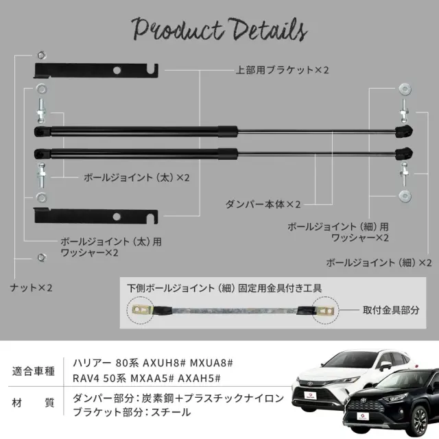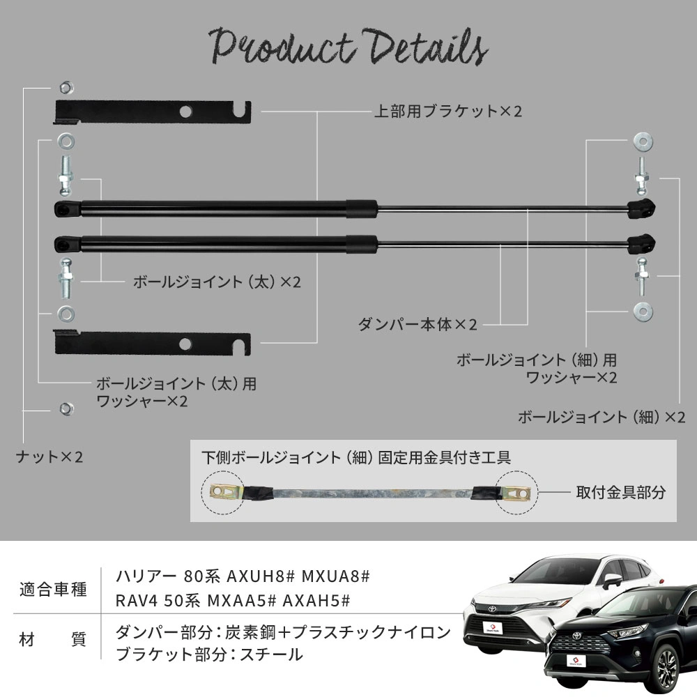 ボルトオン取付けでボンネットの開閉をスムーズに ハリアー 80系/RAV4 50系 ボンネットダンパーです。 [ 材質 ] ダンパー部分:炭素鋼+プラスチックナイロン ブラケット部分:スチール [ カラー ] ブラック [ セット内容 ] 一式/ダンパー本体2p、上部用ブラケット2p、ボールジョイント(太)2p、ボールジョイント(太)用ワッシャー2p、上部用ナット2p、ボールジョイント(細)用ワッシャー2p、ボールジョイント(細)固定用金具付き工具1p [ 装着方法 ] ボルトオンで取付 ■適合車種 ハリアー 80系 AXUH8# MXUA8# R2.6~ RAV4 50系 MXAA5# AXAH5# H31.3~ 全グレード適合