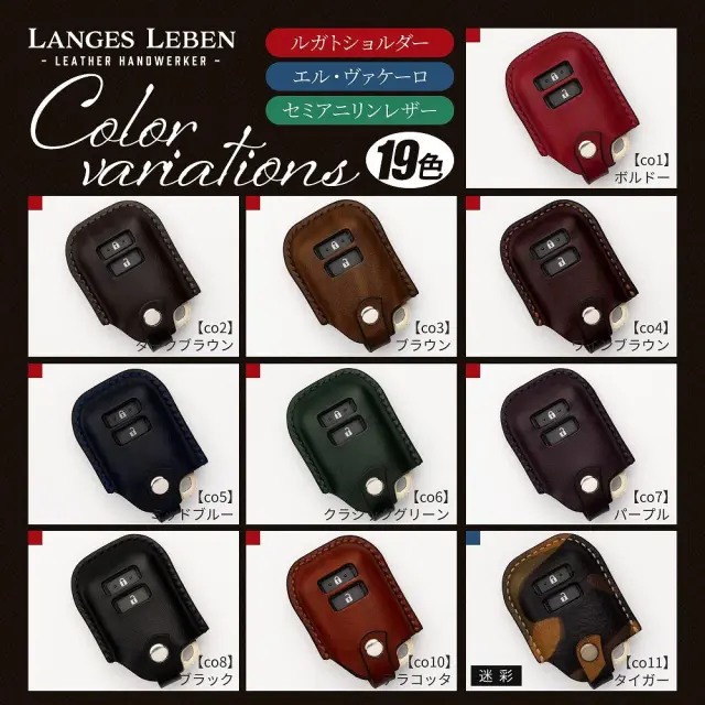 トヨタ汎用 ランゲスレーベン 本革スマートキーカバーです。 [ 材質 ] ルガトショルダー/ベルギー産、エル・ヴァケーロ/ フランス産原皮、セミアニリンレザー/ オーストラリア産原皮 [ カラー ] ボルドー、ダークブラウン、ブラウン、ワインブラウン、ミッドブルー、クラシックグリーン、 パープル、ブラック、テラコッタ、迷彩タイガー、迷彩フォレスト、迷彩コバルト、迷彩スメラルド、迷彩ネロ、迷彩バービー、迷彩ロッソ、ダークチェスナット、サンセットブラウン、ノアール [ セット内容 ] キーカバー×1 [ サイズ ] 2ホール2ボタン/3ホール3ボタン/3ホール4ボタン ■適合車種 ハイエース 200系 4型 5型 6型 7型 8型 H25.12~ レジアスエース 200系 4型 5型 6型 7型 H25.12~ ポルテ NSP14#系 H24.6~ スペイド NCP14#系 H24.6~