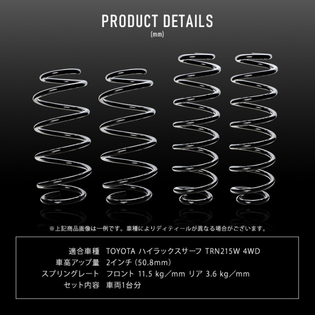 リフトアップでアクティブな車両にカスタマイズできるリフトアップスプリングです。 [ 材質 ]SUP9/SAE9254 [ 車高アップ量 ] 2インチ(50.8mm) [ スプリングレート ]フロント 11.5 kg/mm リア 3.6 kg/mm [ 適合車種 ]ハイラックスサーフ TRN215W 4WD