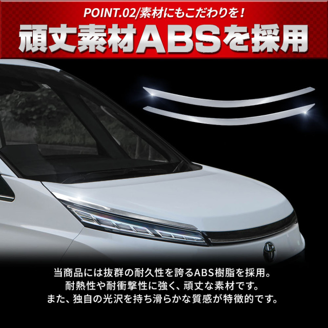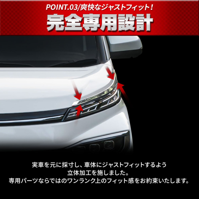 ヘッドライトまわりにメッキの輝きをプラス! [材質] ABS樹脂 [セット内容] 2p+脱脂剤+取扱説明書 [装着方法] 裏面強力テープで簡単装着 ■適合車種 ヴォクシー90系ZWR9#WMZRA9#(R4.1~)