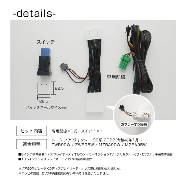 簡単取付で走行中のTV視聴やナビ操作が可能なノア ヴォクシー 90系 ナビキャンセラーです。 [ 材質 ] 配線 [ セット内容 ] 専用配線×1式 スイッチ×1 説明書 [ 装着方法 ] 簡単接続で配線を傷つけないカプラーオン設計 ■適合車種 トヨタ ノア ヴォクシー 90系 2022(令和4)年1月~ ZWR90W / ZWR95W / MZRA90W / MZRA95W ■8インチ標準装備ディスプレイオーディオかつメーカーオプションTV(フルセグ)+CD・DVDデッキ装着車適合 ■10.5インチディスプレイオーディオPlus装着車適合