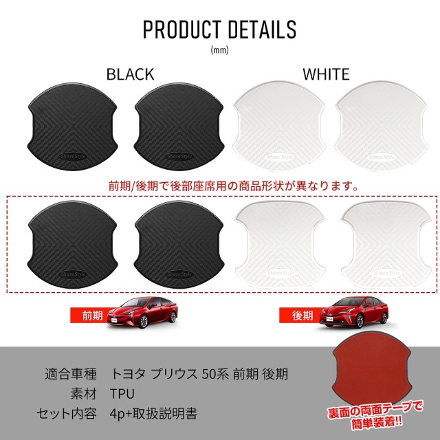 ドアノブを爪キズから守りドレスアップ効果も抜群! プリウス 50系 前期 後期 対応ラバードアプロテクターです。 [ 材質 ] TPU [ カラー ] ブラック/ホワイト [ セット内容 ] 4p+粘着促進剤+取扱説明書 [ 装着方法 ] 裏面強力両面テープで貼り付け ■適合車種 プリウス 50系 前期 H27.12~H30.11 ZVW5#、プリウス 50系 後期 H30.12~R4.12 ZVW5#