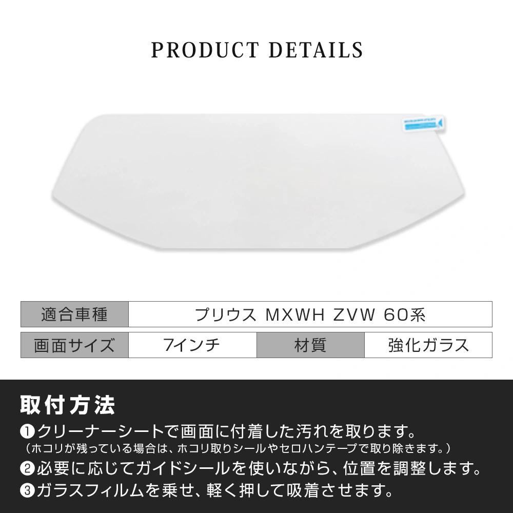 強化ガラスでモニターを守る プリウス 60系 トップマウントメーター 保護フィルムです。 [ 材質 ] 強化ガラス [ 硬度 ] 9H [ セット内容 ] 本体1p+クリーナーシート(ウェット・ドライ)+ホコリ取りシール+ガイドシール [ 装着方法 ] トップマウントメーターに貼り付け ■適合車種 トヨタ プリウス MXWH60 ZVW60(令和5年1月~)