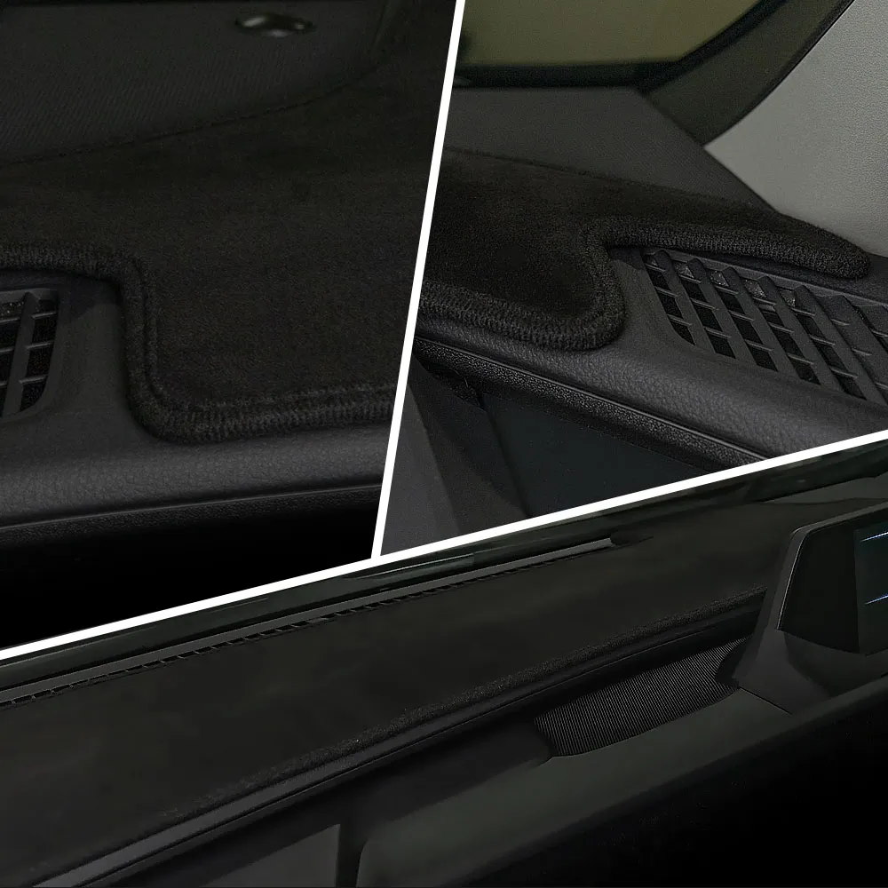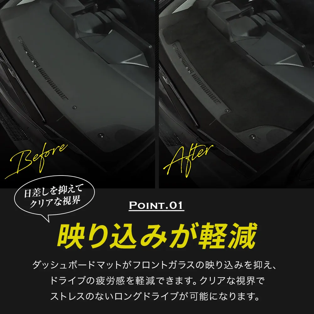 プリウス60系ダッシュボードマットは、快適なドライブをサポートする必需品です。スエード調素材が高級感を演出します。日差しを効果的に抑え、視界をクリアに保つことで、安全運転をサポート。さらに、UVカット機能で紫外線から内装を守ります。ブラックのシンプルなデザインが、プリウス60系の内装をスタイリッシュにドレスアップします。