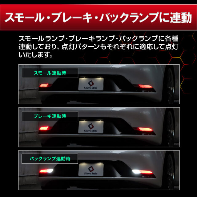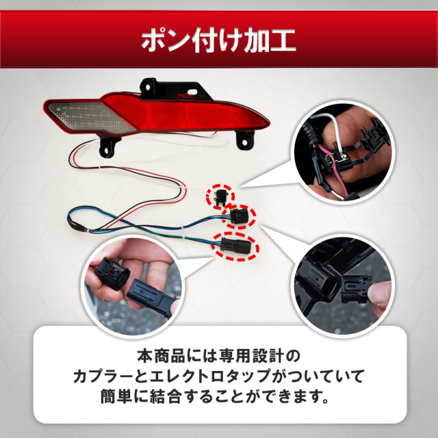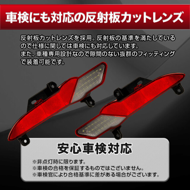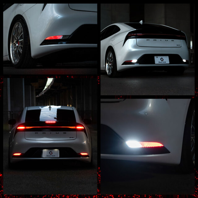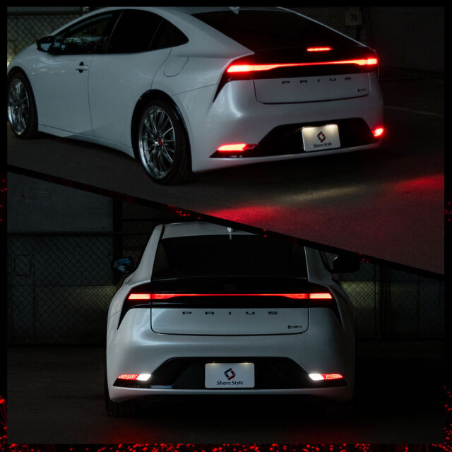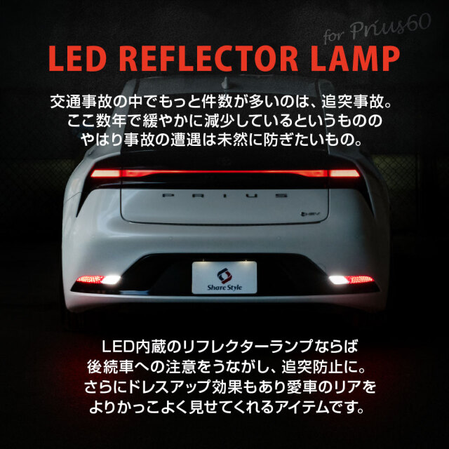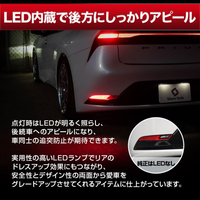 プリウス 60系 LEDリフレクターは、車両の後方をスタイリッシュに演出するアクセサリーです。ON/OFF切替機能付きで、ブレーキやポジション、バックランプと連動し、車検にも対応しています。LEDの明るい光が後続車への視認性を高め、追突防止に寄与します。実用性とデザイン性を兼ね備えたこの製品は、愛車のリアをグレードアップさせる理想的なアイテムです。