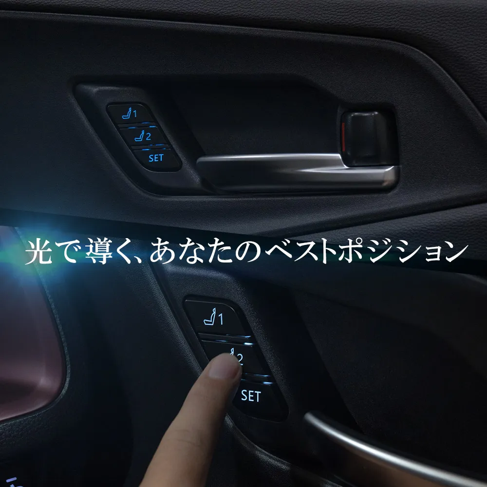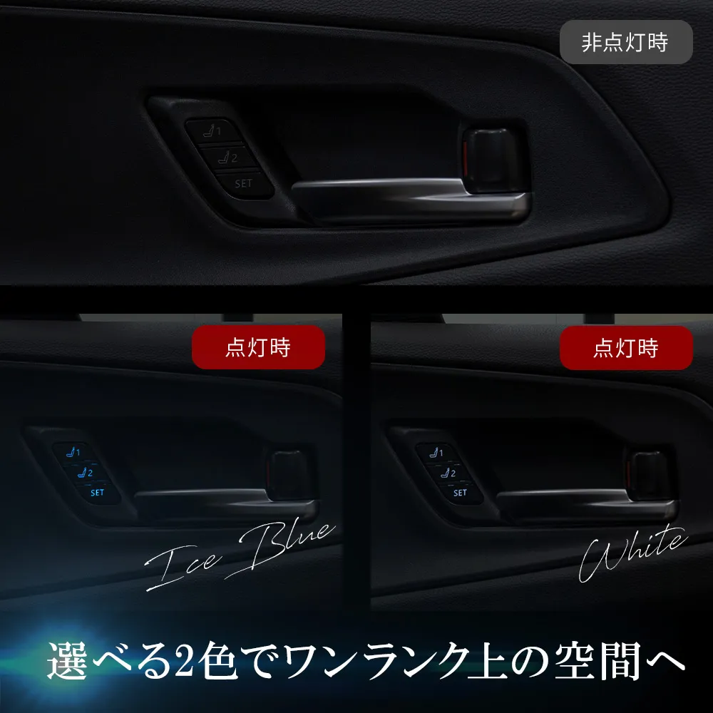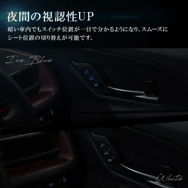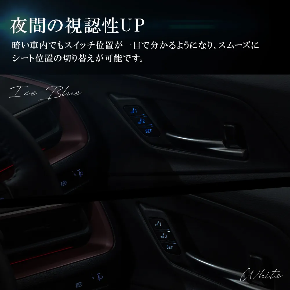 プリウス60系専用のシートポジションメモリー用LEDスイッチは、夜間でもボタン位置が分かるように設計されています。青と白の発光が選べる配線選択式で、車内に溶け込む上品な発光が特徴です。純正のような仕上がりで、車内の印象を引き締めます。視認性を高めるだけでなく、エレガントな雰囲気を演出し、ドライブをより快適にします。