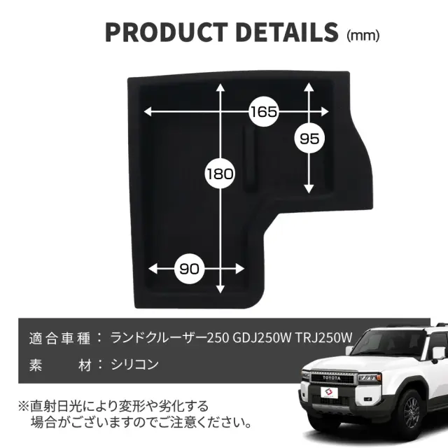 オープントレイの傷防止と防音に最適 ランクル 250 オープントレイマットです。 [ 材質 ] シリコン [ カラー ] ブラック [ セット内容 ] 1p [ 装着方法 ] 置くだけ簡単装着 ■適合車種 ランドクルーザー250 GDJ250W TRJ250W R6.4〜 ※「置くだけ充電」装備車は装着不可です。