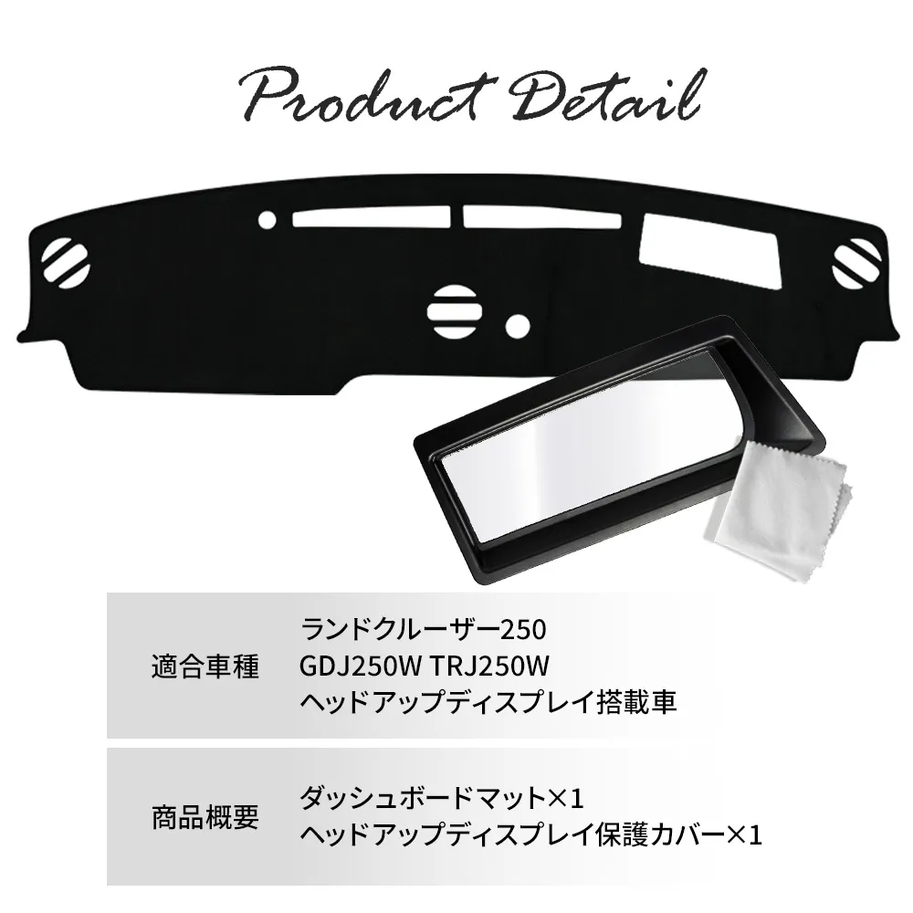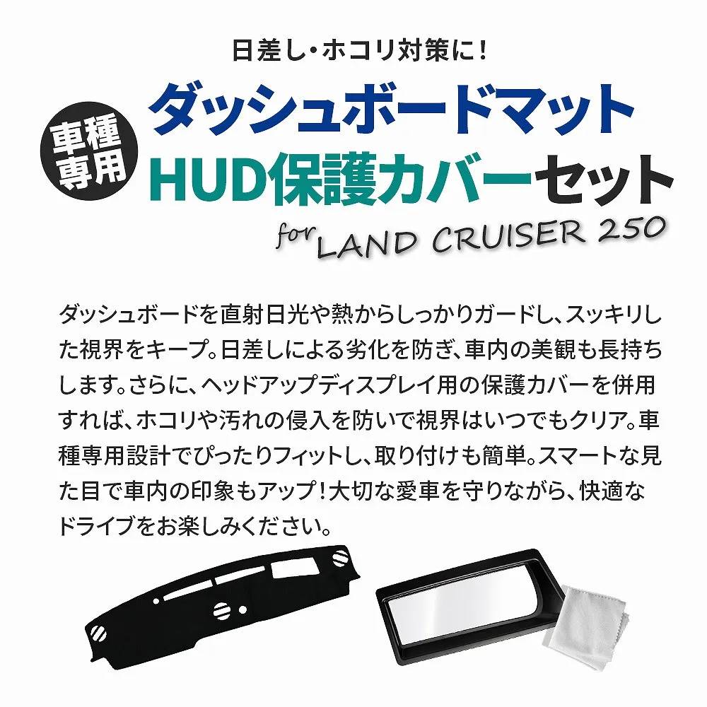 ランクル250 専用!ダッシュボードマットとヘッドアップディスプレイ保護カバーの豪華2点セット。直射日光やホコリ、キズからしっかりガードし、愛車の美しさをキープ!専用設計だからフィット感も抜群。工具不要で簡単取り付け、車内の高級感アップにも最適。お得なセット購入で快適ドライブを手に入れよう!