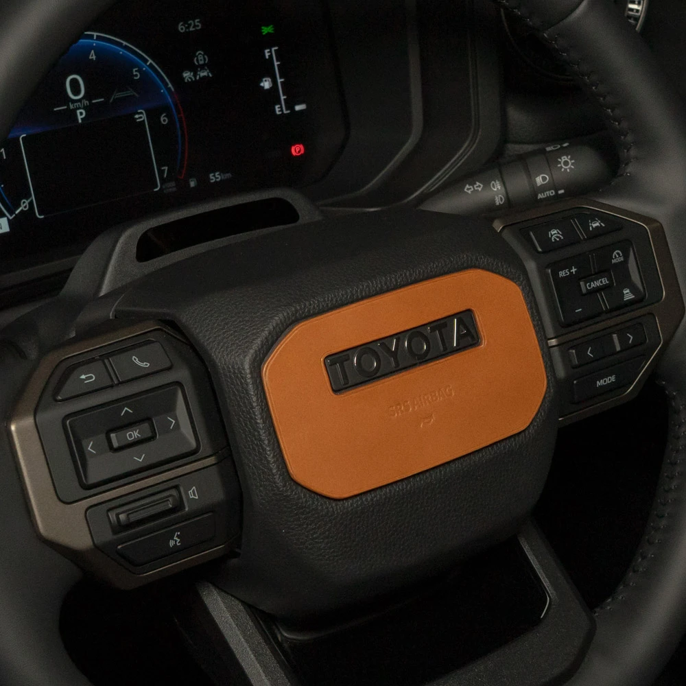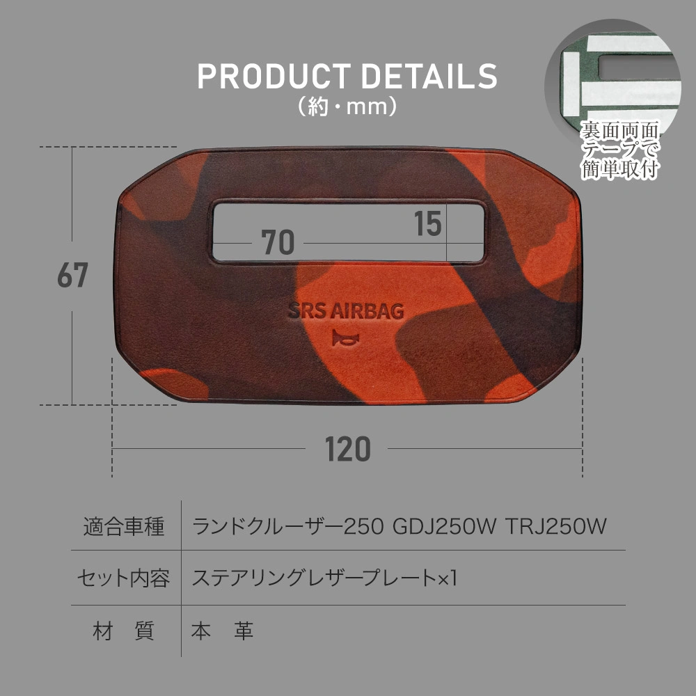 【予約 受注生産】 ランクル 250 ステアリング レザー プレートです。 [ 材質 ] 本革 [ カラー ] ボルドー、ダークブラウン、ブラウン、ワインブラウン、ミッドブルー、クラシックグリーン、 パープル、ブラック、テラコッタ、迷彩タイガー、迷彩フォレスト、迷彩コバルト、迷彩スメラルド、迷彩ネロ、迷彩バービー、迷彩ロッソ、ダークチェスナット、サンセットブラウン ■適合車種 ランドクルーザー250 GDJ250W TRJ250W R6.4~