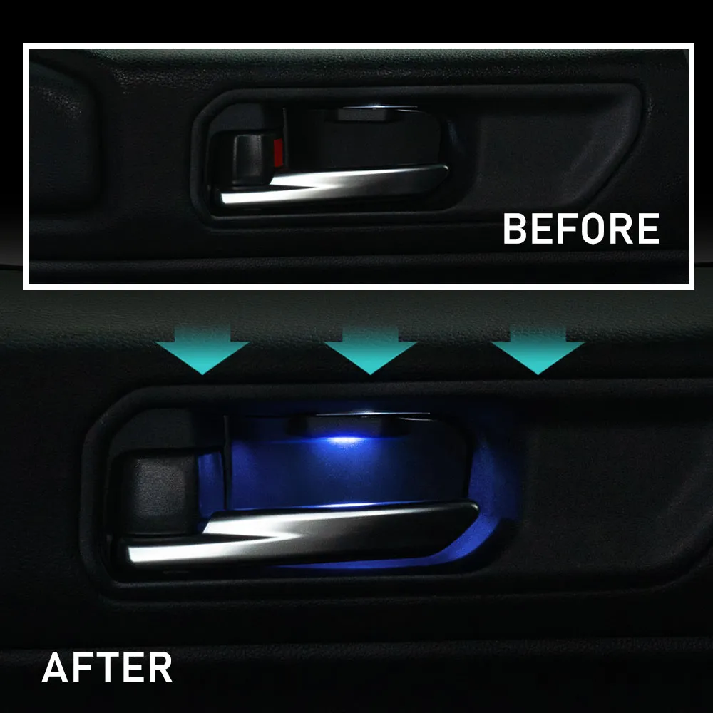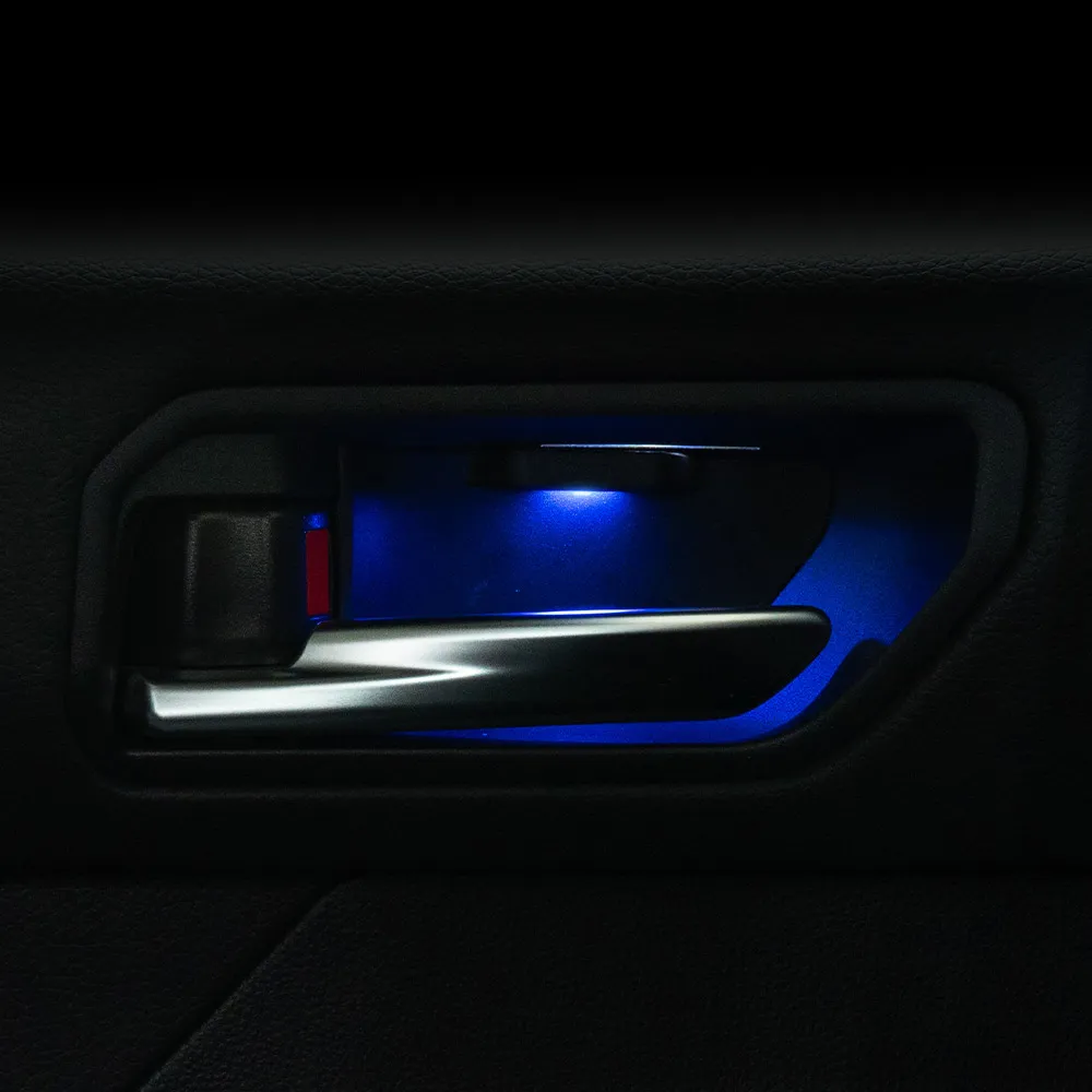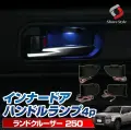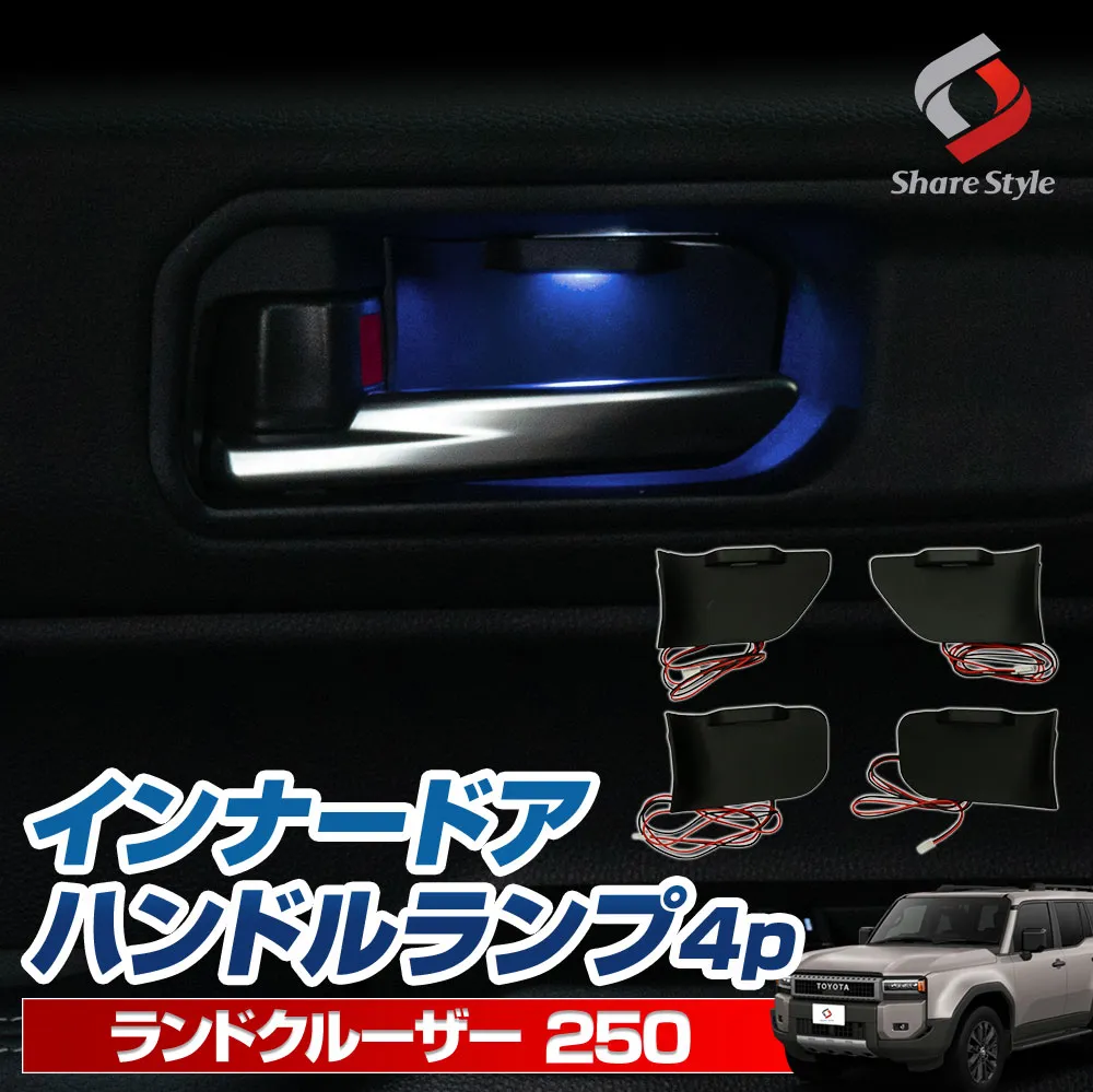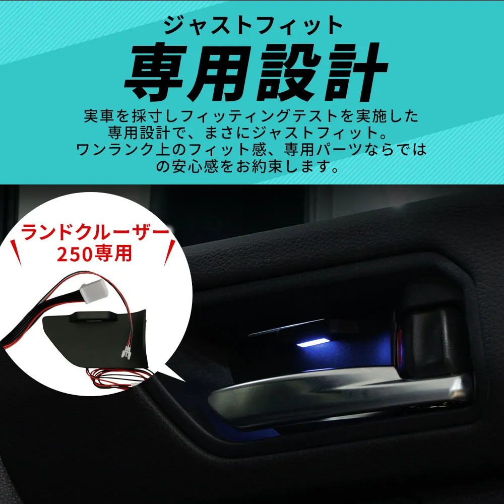 ランクル 250 インナードアハンドルランプは、トヨタ ランドクルーザー専用に設計されたカスタムパーツです。青色LEDがドアノブ周辺を美しく照らし、車内の雰囲気を一層引き立てます。専用設計により、フィッティングも完璧で、取り付けも簡単です。インテリアのドレスアップに最適なこのアクセサリーは、車内をスタイリッシュに演出します。