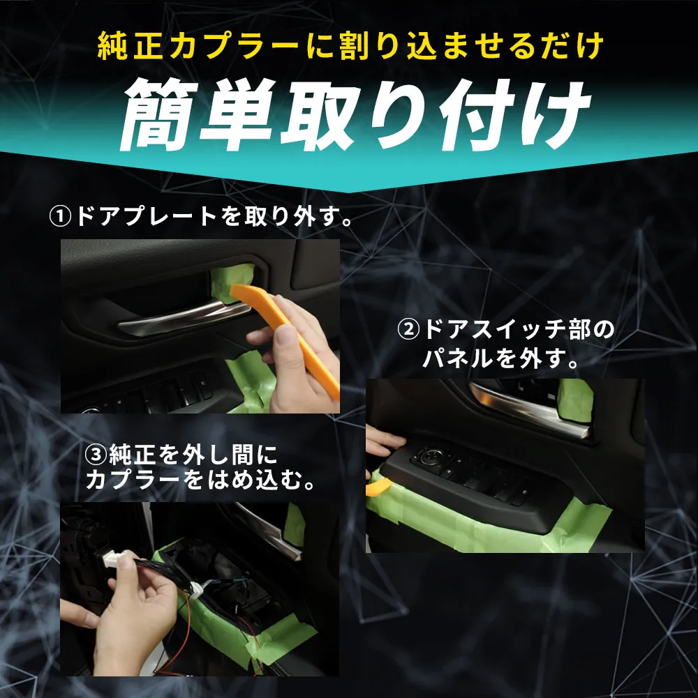 他車と差をつけるカスタムで愛車をドレスアップ ランクル 250 インナードアハンドルランプ 4pです。 [ 材質 ] LED、ABS樹脂 [ カラー ] ブルー [ セット内容 ] 本体4p、カプラー配線4p、内張りはがし [ 装着方法 ] カプラーオンで簡単取付 ■適合車種 ランドクルーザー250 GDJ250W TRJ250W R6.4~