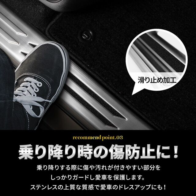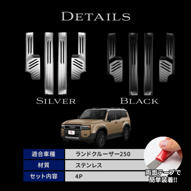 貼るだけ簡単取り付けで愛車を傷や汚れから守る ランクル 250 インナー スカッフ プレート 4pです。 [ 材質 ] ステンレス製(ヘアライン加工) [ カラー ] シルバー/ブラック [ セット内容 ] 4pcs+マスキングテープ [ 装着方法 ] 裏面両面テープ貼り付け ■適合車種 ランドクルーザー250 GDJ250W TRJ250W R6.4~