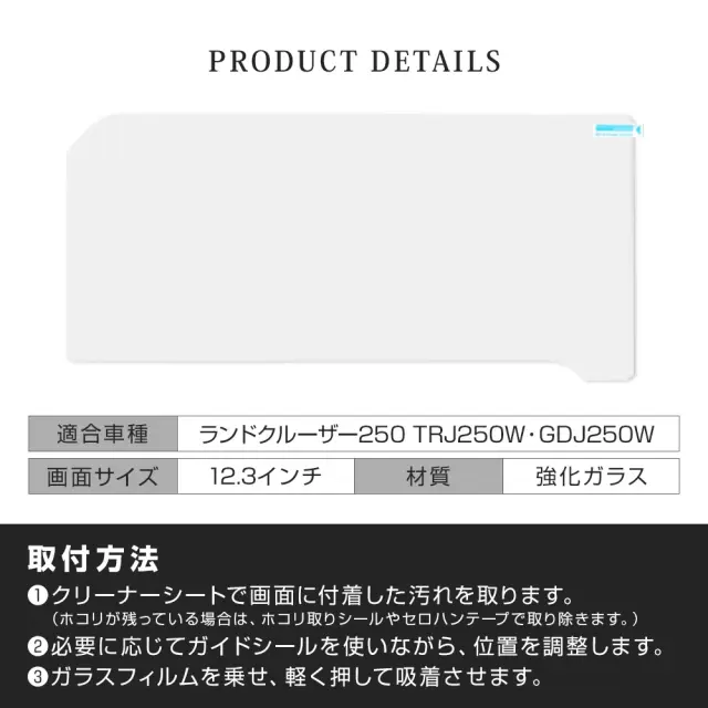 愛車のモニターをしっかり保護 ナビ保護フィルム 12.3インチ ランドクルーザー250系 ナビ保護フィルム 12.3インチです。 [ 材質 ] 強化ガラス [ 硬度 ] 9H [ セット内容 ] 本体1p+クリーナーシート(ウェット・ドライ)+ホコリ取りシール+ガイドシール [ 装着方法 ] ディスプレイに貼り付け ■適合車種 ランドクルーザー250 TRJ250W GDJ250W R6.4~ (ZX,VX対応)