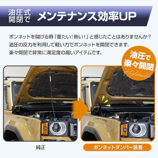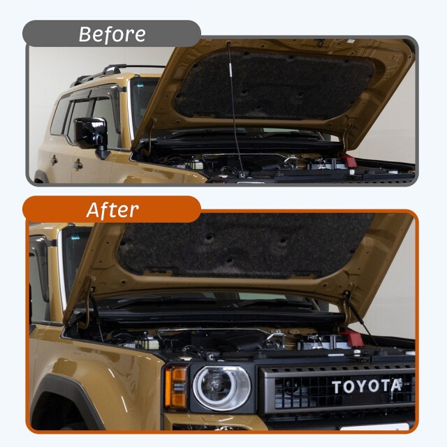 ランクル 250 ボンネットダンパーは、重いボンネットの開閉をスムーズにし、メンテナンス効率を大幅に向上させます。ブラックのスタイリッシュなデザインで、ランドクルーザー250のエンジンフードをカスタムするのに最適です。簡単装着が可能なボルトオンタイプで、取り付けも手軽。日常のメンテナンスをより快適にし、愛車の魅力を引き立てます。ボンネットの開閉が楽になることで、作業の効率もアップします。