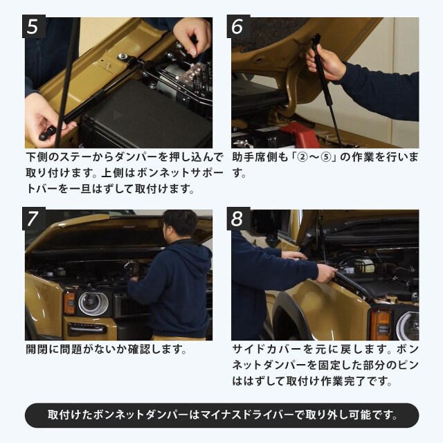 | ※作業順番や向き、左右を確認の上、取り付けをしてください。 ※使用上や環境により油圧の寿命が短くなる場合がございます。 ※取付けの際、ボンネット内サイドカバー用のクリップ穴を1ヶ所使用しますので、クリップを1ヶ所取り外す必要があります。 ※本商品取付け後は純正よりボンネットが若干大きく開いた角度となる仕様です。 ※グレード・追加オプション・エアロパーツ・社外品等を装着している車によっては形状が合わない場合があります。お乗りのお車と商品画像を見比べて合うことをご確認の上、ご購入をお願いいたします。 ※車両適合情報は本製品発売時のものになります。その後の車両側の仕様変更や改修によっては正常に動作/適合しない場合がありますのでご注意ください。 ※取り付けの際の工賃等の請求は一切受け付けません。 ※お取り付けは、自己責任にて、作業を行って下さい。お客様責任による破損での対応は受付できません。 ※必ずフィッティング確認を行ってから取り付けてください。 ※社外品につき小傷等がある場合がございますが、使用に支障がない限り交換、返品はいたしません。 ※本製品を使用したことによる直接、間接的に生じた事故、損害、破損についての責任は弊社は一切負いません。 ※モニターの環境により商品の色合いや素材感などが異なる場合がございます。 ※商品は予告なく仕様変更もしくは販売終了している場合がございますのであらかじめご了承ください。 ※国外への配送はEMSでの発送です。ご注文後、弊社よりメールにて別途送料などをお知らせいたします。 |
