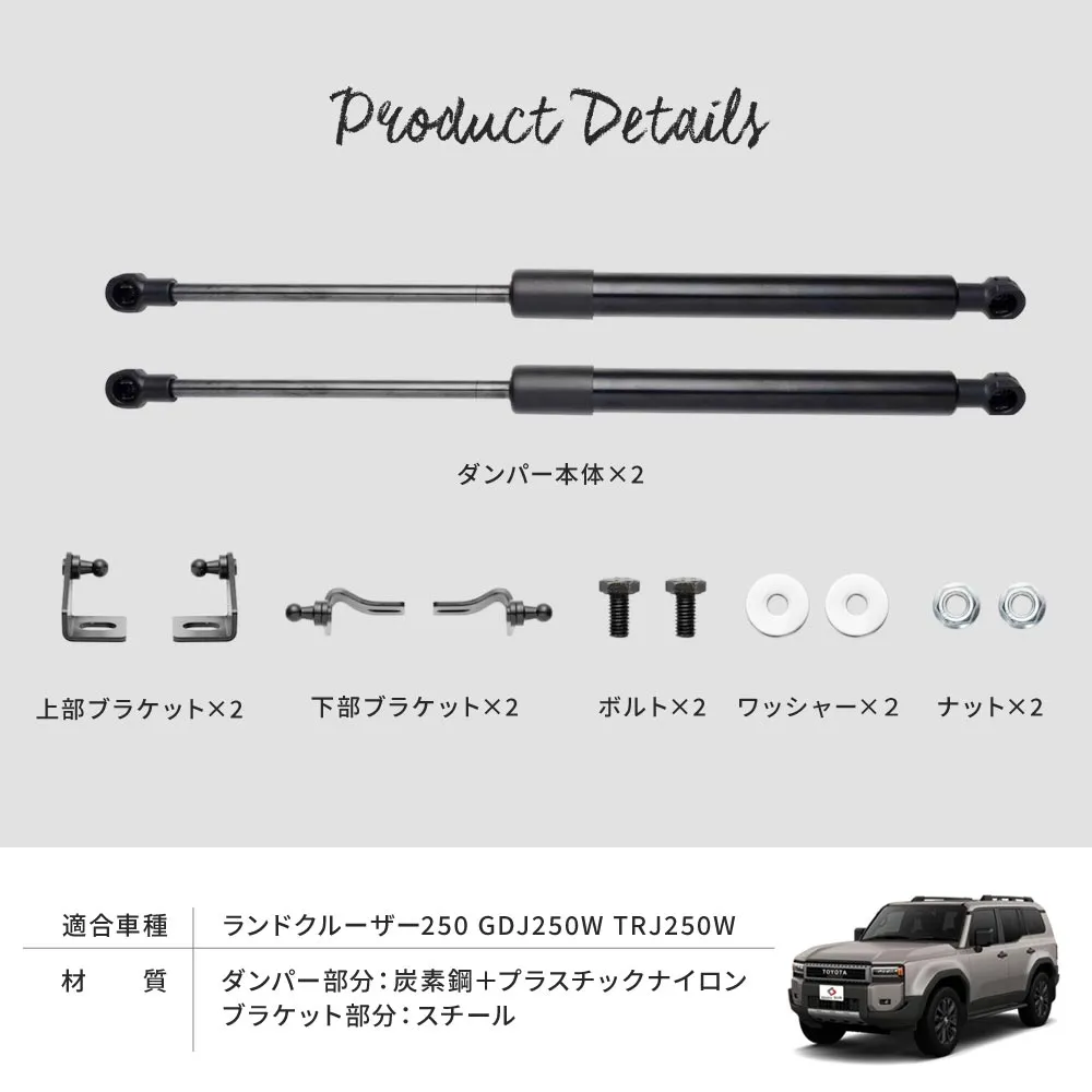 ボルトオン取付けでボンネットの開閉をスムーズに ランクル 250 ボンネットダンパーです。 [ 材質 ] ダンパー部分:炭素鋼+プラスチックナイロン ブラケット部分:スチール [ カラー ] ブラック [ セット内容 ] 一式(ダンパー本体2p、ブラケット4p、ボルト2本、ナット2個、ワッシャー4枚) [ 装着方法 ] ボルトオンで取付 ■適合車種 ランドクルーザー250 GDJ250W TRJ250W R6.4~