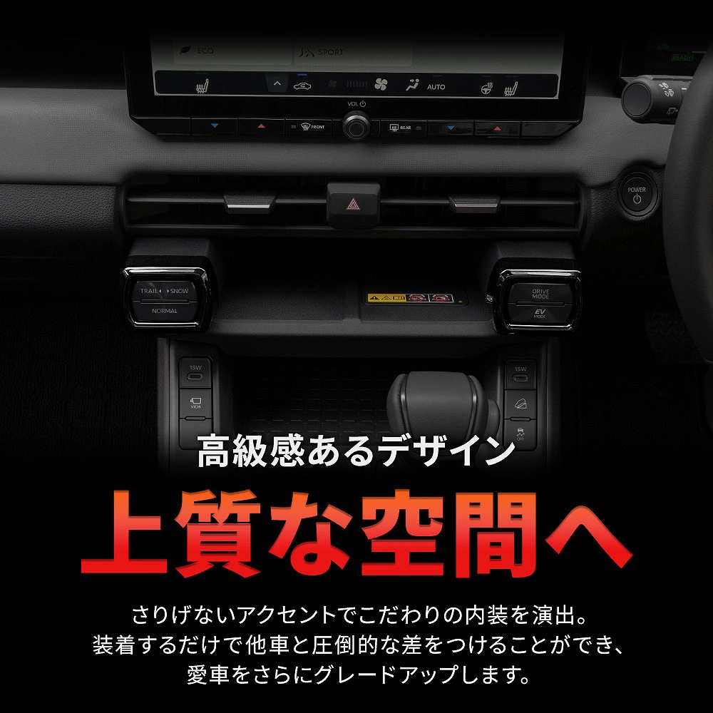 RAV4 60系用のドライブモードセレクトカバーは、車内のインパネをスタイリッシュにドレスアップするためのアイテムです。ピアノブラックの仕上げが高級感を演出し、傷や劣化からスイッチを保護します。簡単に取り付けられるため、手軽に車内の印象を変えることができます。トヨタのRAV4 60系にぴったりフィットし、車の美観を損なうことなく、機能性を向上させます。