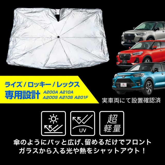 車種専用設計でぴったりフィット ライズ ロッキー レックス A200A A210A A200S A210S A201F 傘型サンシェード 収納袋つき です。 [ 材質 ] 生地:シルバー塗装ポリエステル、骨:グラスファイバー [ カラー ] 表面:シルバー/裏面:ブラック [ セット内容 ] 1p [ 装着方法 ] 開いてフロントガラス内側に取り付けるだけの簡単装着 ■適合車種 トヨタ ライズ A200A A210A(R1.10~) ダイハツロッキー A200S A210S(R1.10~) スバル レックス A201F(R4.11~)
