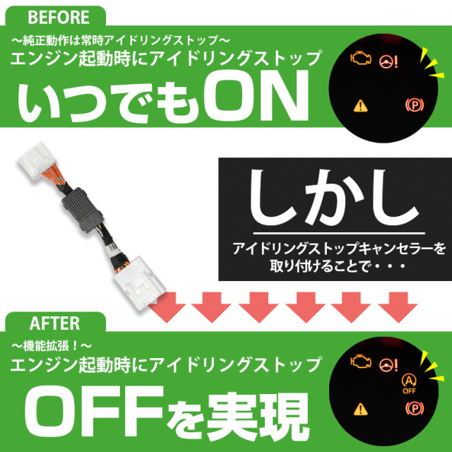 | アイドリングストップ機能を一度OFFにすると継続的にOFFの状態を持続することが可能です。 アイドリングストップをキャンセルすることにより… ■走り出しのレスポンスが向上します ■バッテリーの負荷を軽減します ■エンジン始動時に使用されるセルモーターの寿命延長します ■エンジン始動時の振動で負荷のかかるゴム部品の劣化を抑える効果があります。 |