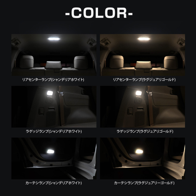 純正では物足りないルームランプを明るく綺麗に ランドクルーザー 300系 LEDルームランプ 6pです。 [ 材質 ] LED [ カラー ] シャンデリアホワイト/ラグジュアリーゴールド [ セット内容 ] リアセンター×1 + ラゲッジランプ×1 + カーテシランプ×4 + 配線 + 内張りはがし + 取扱説明書 [ 装着方法 ] 純正交換 ■適合車種 ランドクルーザー 300系 FJA VJA 300 R3.8~ ※本商品はZX VX GRスポーツ グレード専用です。 ※AX GXグレードは適合いたしません。