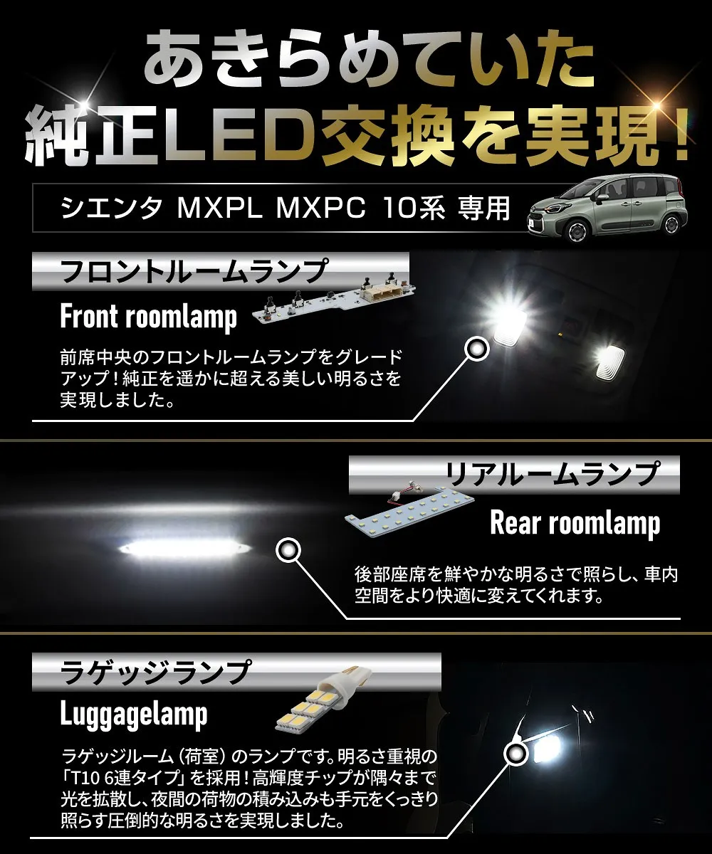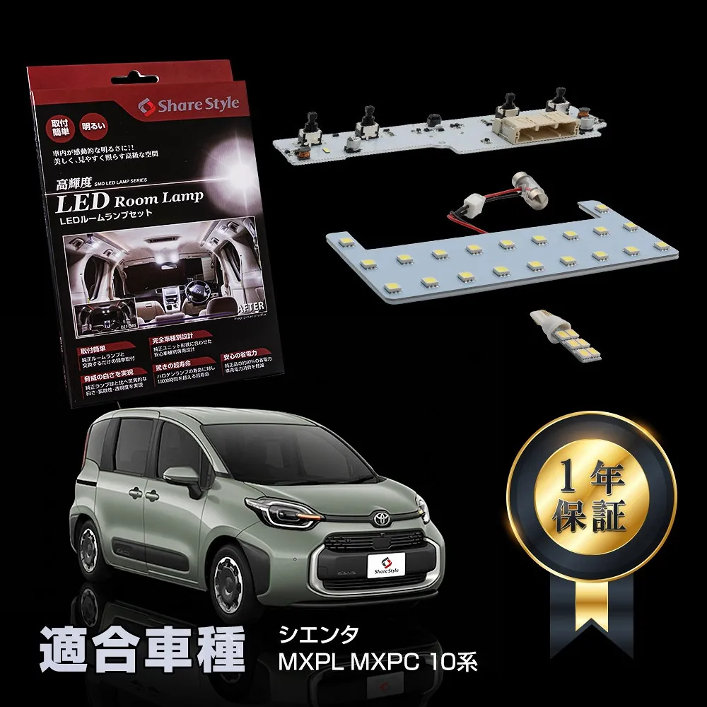 シエンタ MXPL MXPC10系 LED ルームランプ セットです。 [ 商品概要 ] 純正を遥かに凌ぐ明るさと高級感あふれる美光 [ 材質 ] LED 基板 [ セット内容 ] 【フルセット】フロント×1、リアセンター×1、ラゲッジ×1、内張りはがし、パッケージ 【フロントのみ】フロント×1 【リアのみ】リアセンター×1、ラゲッジ×1 [ 装着方法 ] 純正交換 ■適合車種 シエンタ MXPL MXPC10系 R4.8~
